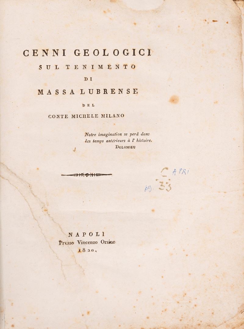 Napoli, Prosso Vincenzo Orsino, 1820. In 8°. Una carta di tavola ripiegata al fine rappresentante la penisola sorrentina. Fioriture e tracce d'umidità al frontespizio. Legatura in mezza pelle marrone con angoli, e titolo in oro al dorso.