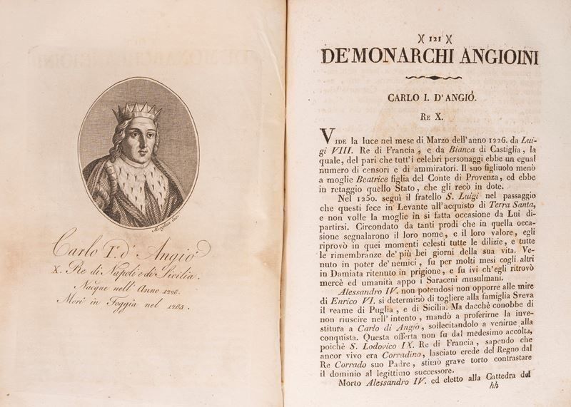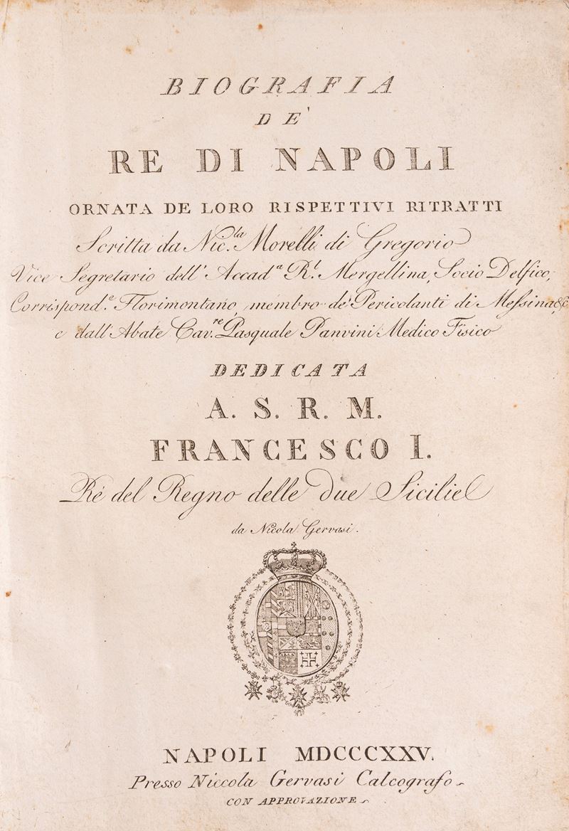 Napoli, Nicola Gervasi, 1825. In 4°. Armi di Francesco I Borbone al frontespizio, ritratto di Francesco I inciso da Morghen, 25 ritratti entro ovale, lievi fioriture, legatura coeva in mezza pelle, lievi difetti. § De Renzi, S. Il secolo decimoterzo e Giovanni da Procida. Napoli, Stamperia del Vaglio, Stemma al frontespizio, ritratto, lievi fioriture, legatura coeva in mezza pelle, lievi difetti.