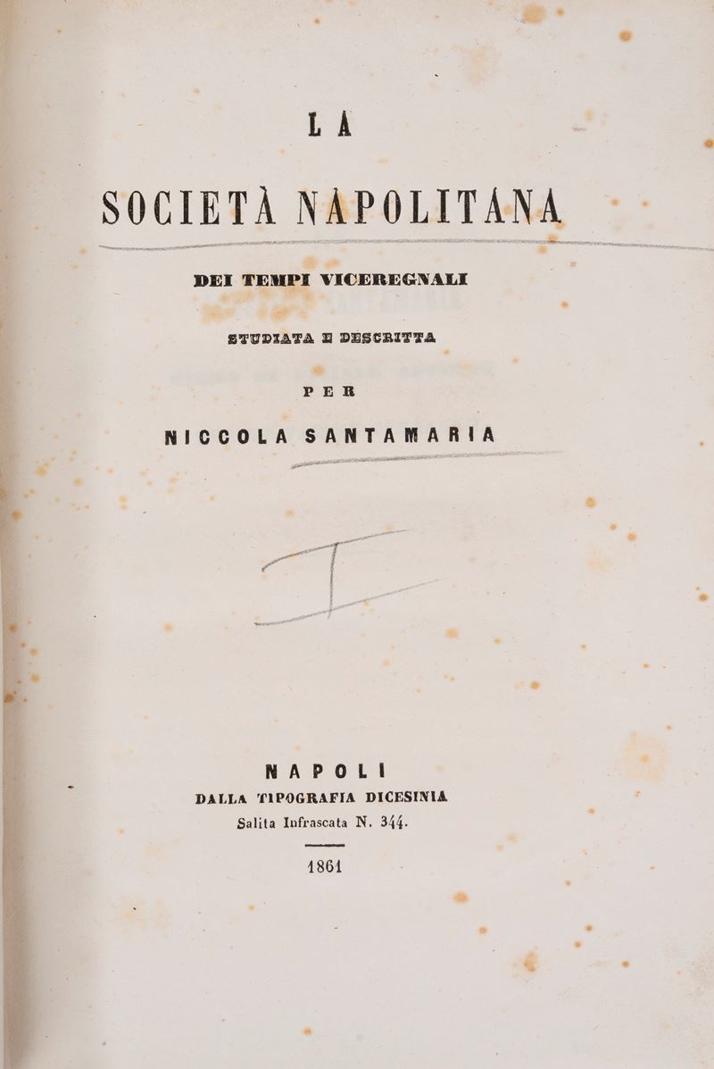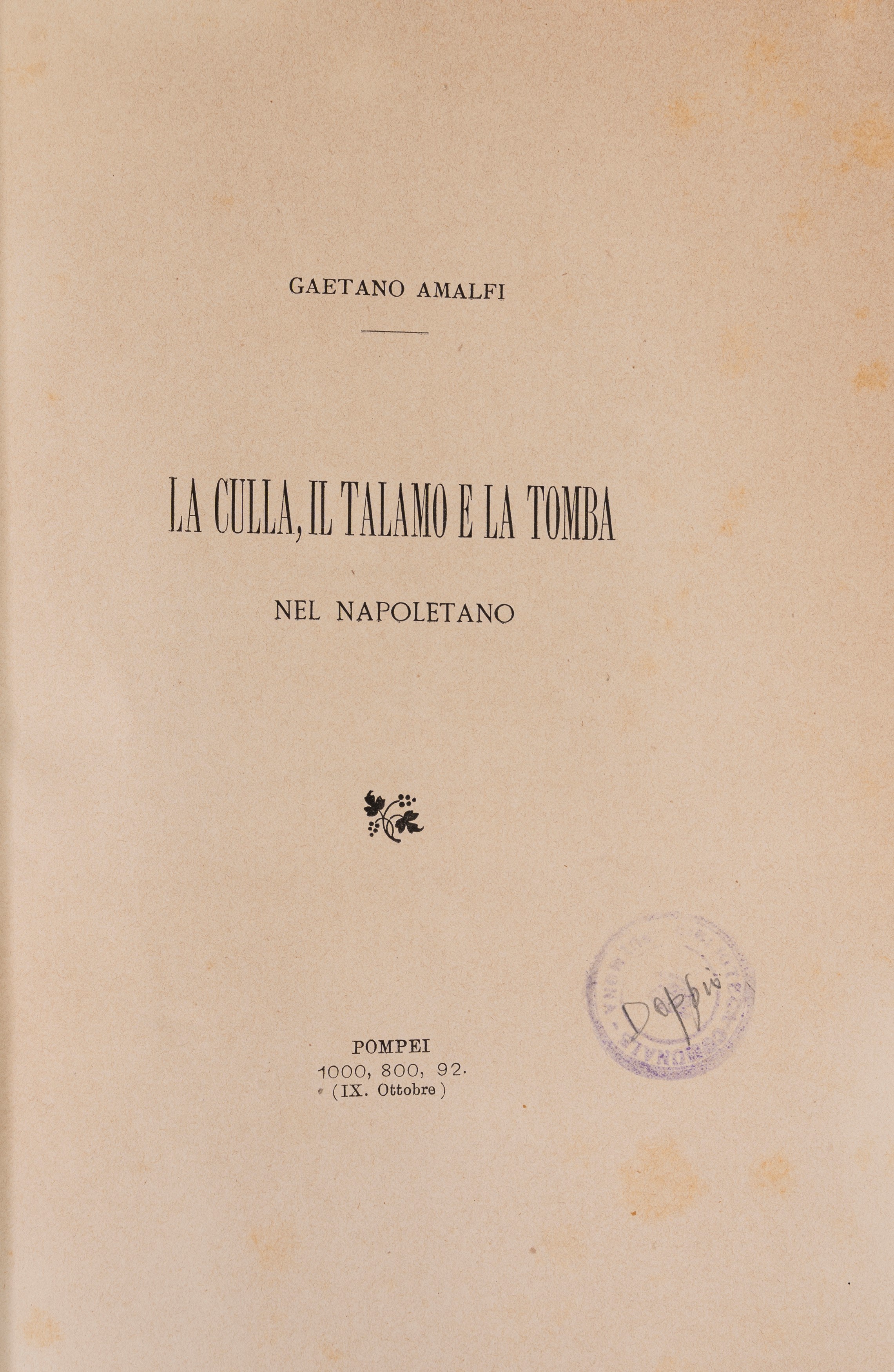 Napoli, Dalla tipografia diocesana, 1861. In 8°. Due volumi in uno. Fioriture. Legatura in mezza pelle marrone e titolo in oro su dorso a 4 nervi. § Amalfi G., La culla, il talamo e la tomba nel napoletano, Napoli, Tipografia di G. M. Priore, 1892. In 8°. Legatura in tela blu.