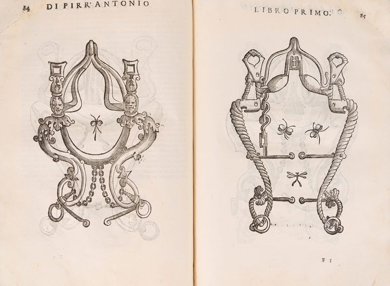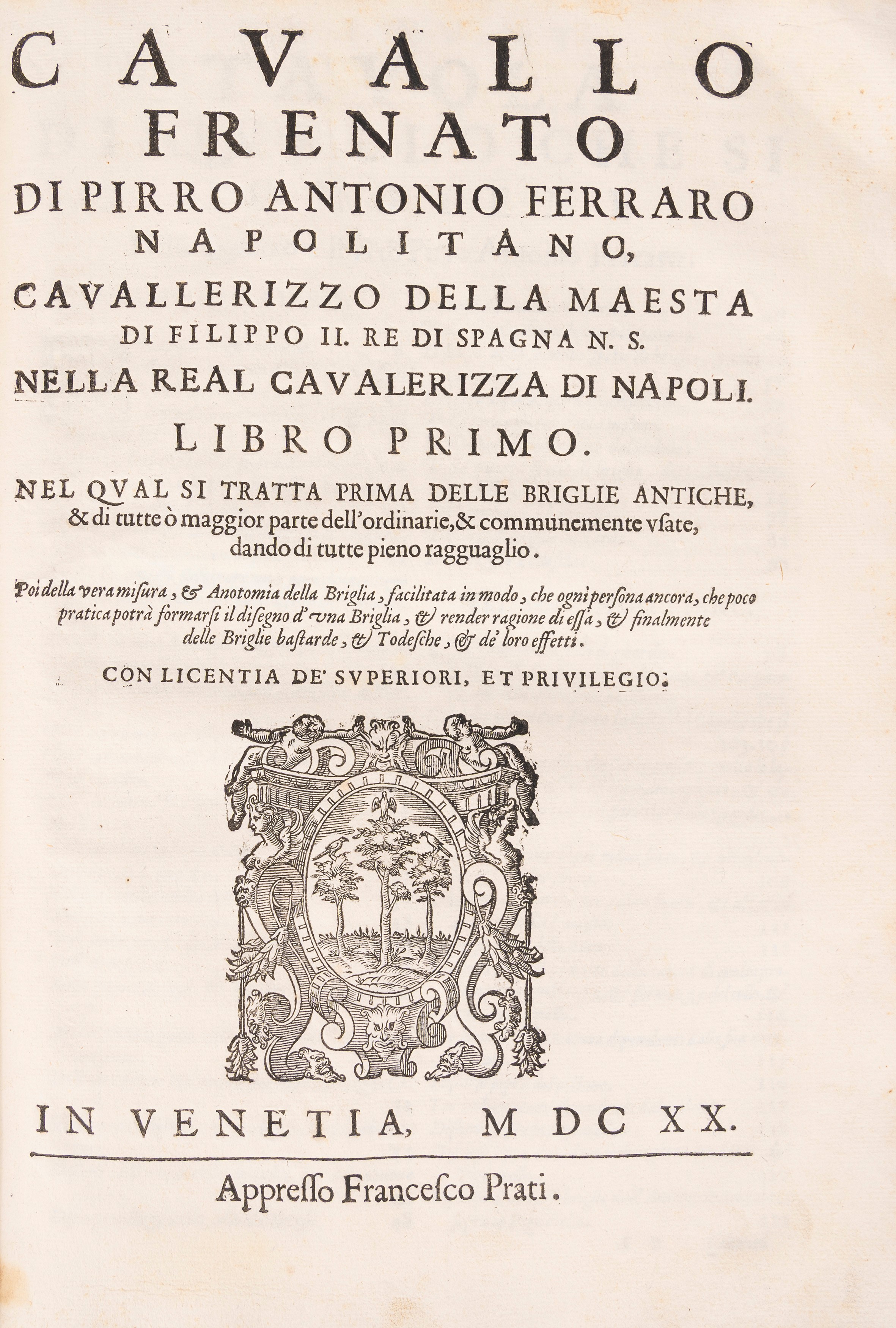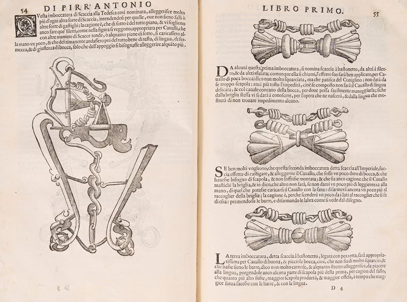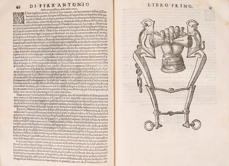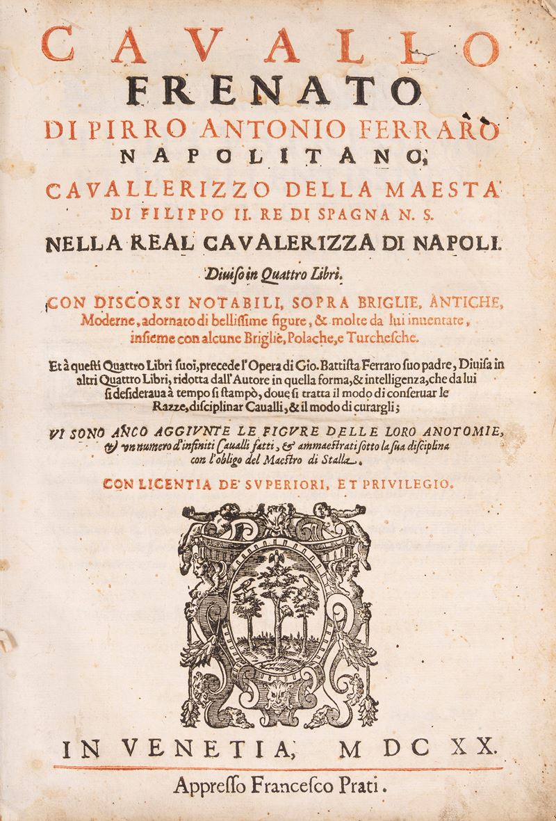 Venezia, Francesco Prati, 1620. In 2°. 2 parti in 1 tomo. Marca tipografica incisa in legno ai frontespizi, frontespizio della prima parte in rosso e nero, 55 illustrazioni xilografiche nel testo e 87 a piena pagina che rappresentano cavalli, morsi e briglie, qualche rara fioritura, legatura coeva floscia in piena pergamena con titolo manoscritto al dorso liscio, piccola mancanza al piatto posteriore, segni del tempo. Ex libris cartaceo al contropiatto. Astuccio in tela.