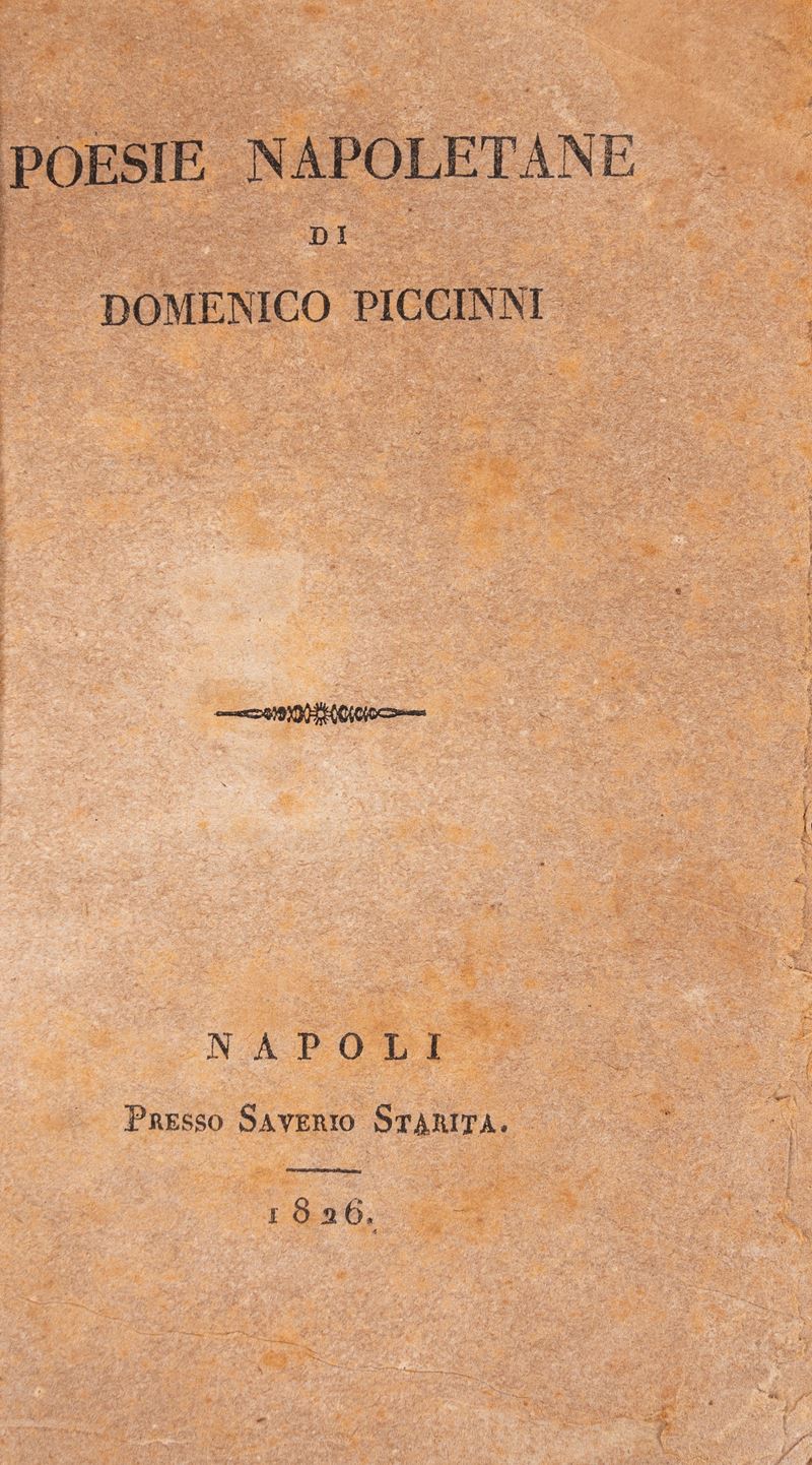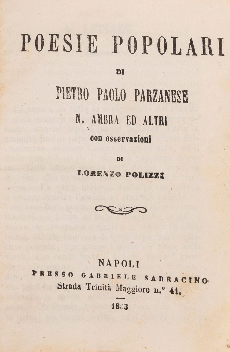 Napoli, Saverio Starita, 1826. In 8°. Fioriture, esemplare in barbe, legatura moderna in mezza pergamena. § Pietro Martorana. Notizie Biografiche e Bibliografiche degli scrittori del Dialetto napoletano. Napoli, Chiurazzi editore, 1874. § Poesie Popolari di Pietro Paolo Parzanese. Napoli, Gabriele Sarracino, 1863. Legatura coeva in mezza pelle e cartone marmorizzato.