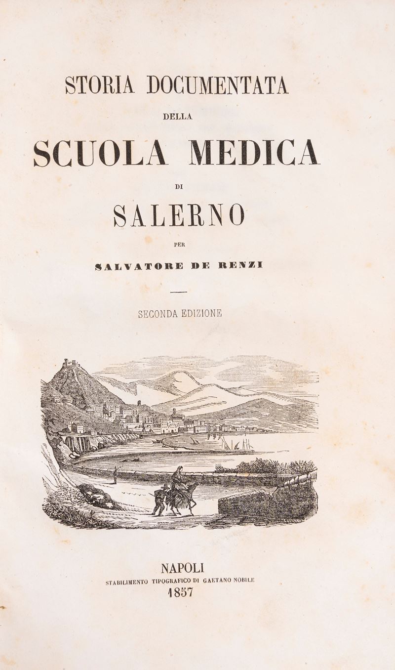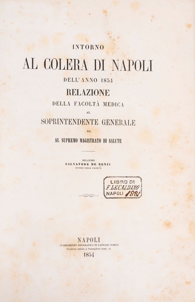 Napoli, Gaetano Nobile, 1857. In 8°. Bella vignetta al frontespizio, qualche lieve fioritura, legatura coeva in mezza pelle, lievi difetti. § Insieme De Renzi,S. Topografia e statistica medica della città di Napoli con alcune considerazioni sul regno intero ossia guida medica per la città di Napoli e pel Regno, Napoli, Giliatre- Sebezio, 1845 § Intorno al colera di Napoli dell'anno 1854 relazione della facoltà medica al Soprintendente generale, Napoli, Gaetano Nobile, 1854.