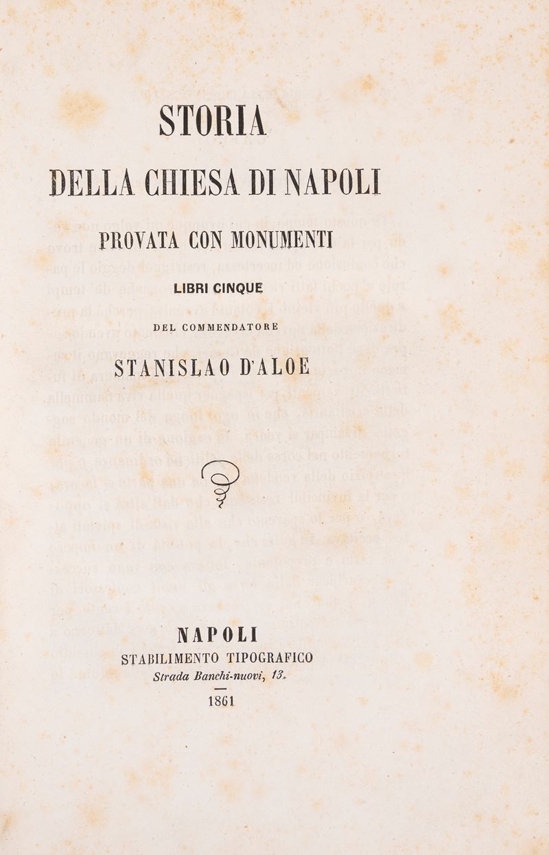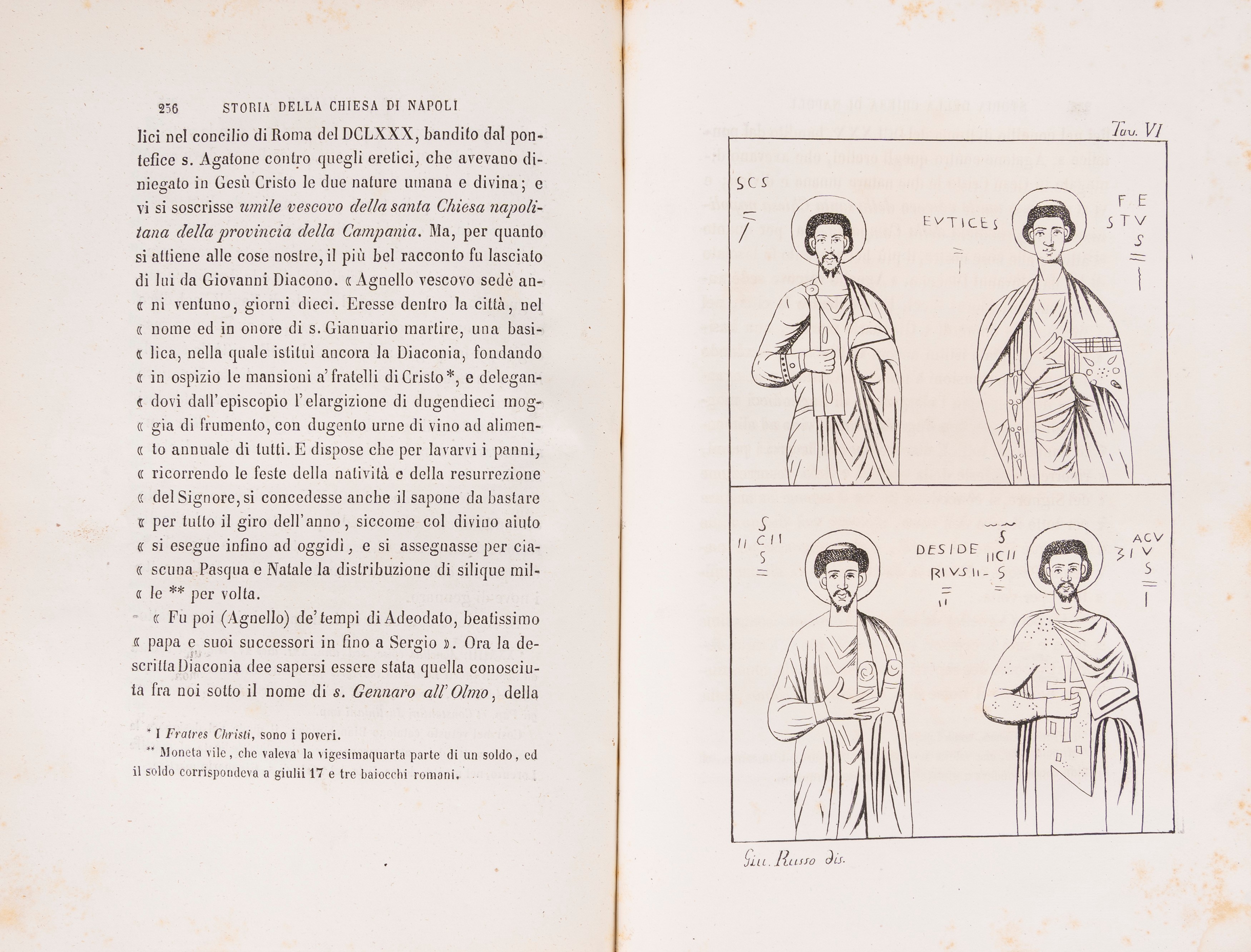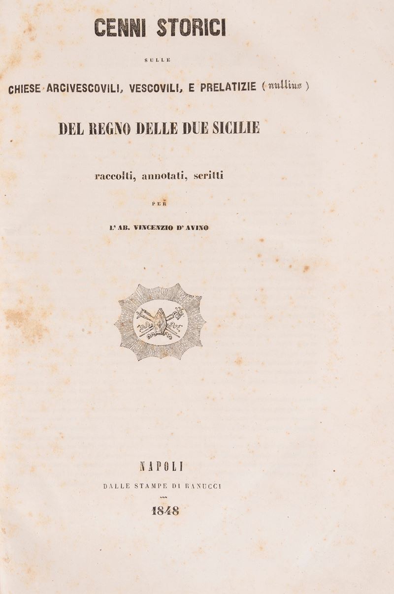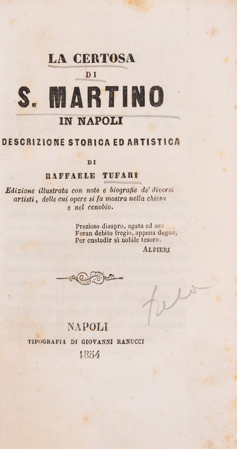 Stabilimento tipografico strada Banchi-Nuovi, 1861. In 8° grande. Con 8 tavole litografiche, qualche lieve arrossatura, legatura coeva in mezza pelle, titolo e fregio in oro al dorso liscio, qualche lieve difetto. § d'Avino, Vincenzo. Cenni storici sulle chiese arcivescovili, vescovili, e prelatizie (nullius) del Regno delle Due Sicilie. Napoli, Ranucci, 1848. In 2°. Fregio al frontespizio, testo su due colonne, qualche lieve fioritura, legatura coeva in mezza pelle, lievi difetti § Tufari, Raffaele. La Certosa di S. Martino in Napoli. Napoli, Ranucci, 1854. In 8°. Con una tavola ripiegata in fine al volume, qualche lieve fioritura, legatura in mezza tela, titolo in oro entro tassello al frontespizio.