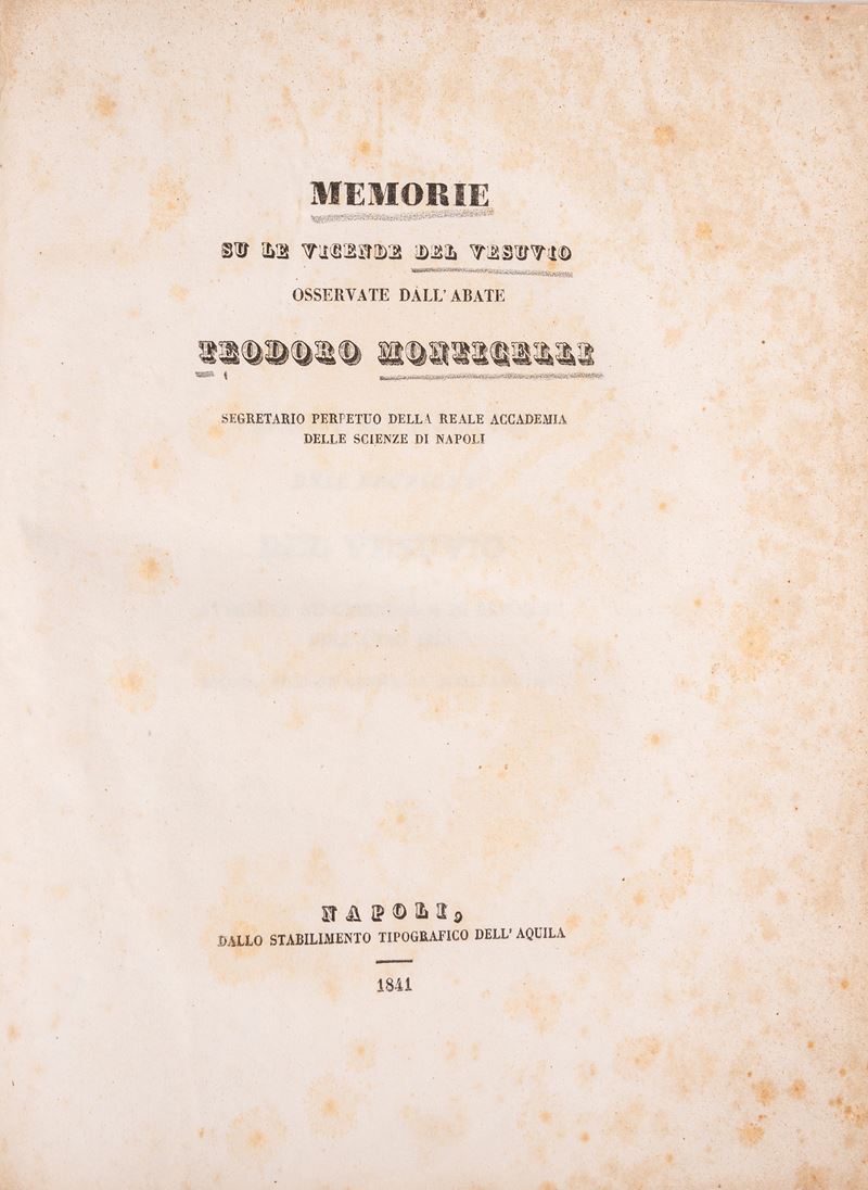 Napoli, Stab. Tip. dell'Aquila, 1841-42. In 4°. 2 parti in un volume, ciascuna con propio frontespizio. Con 6 tavole ripiegate, di cui una di grandi dimensioni e una tabella ripiegata, lievi fioriture, legatura in tela rossa, titolo in oro al dorso.