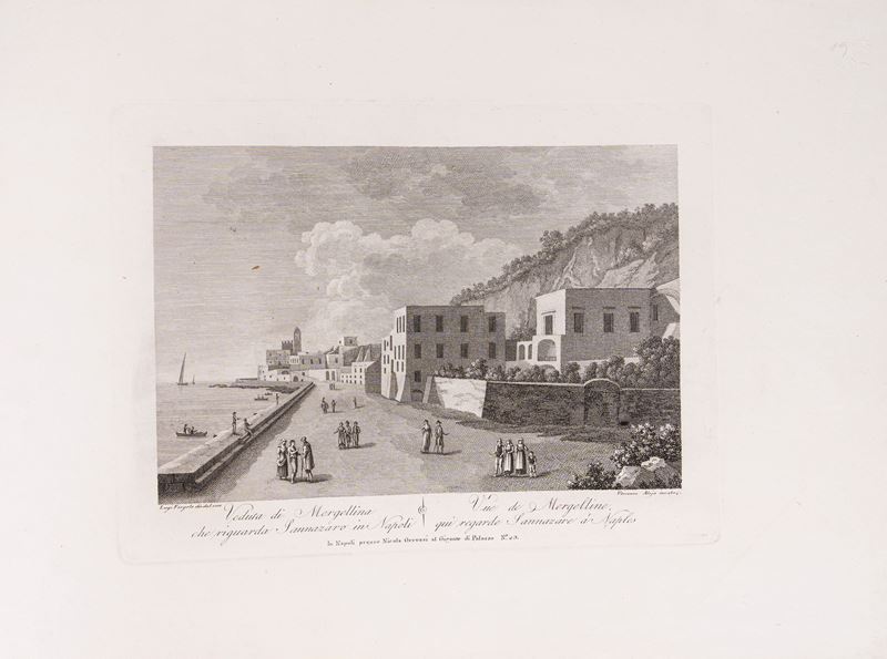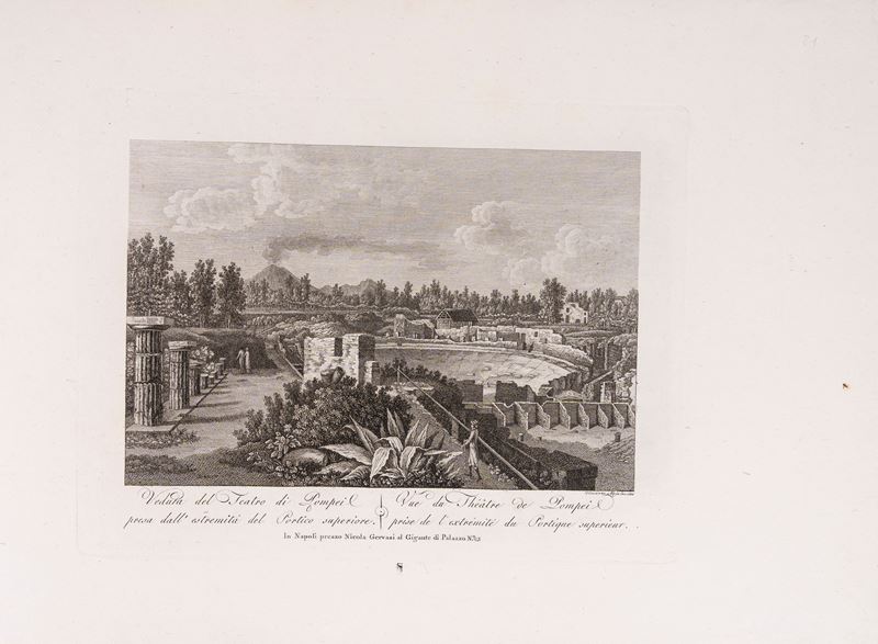 Napoli, Gervasi, [1806?] In folio oblungo (cm 50x35). Antiporta inciso in rame, frontespizio con vignetta, con 27 tavole incise da Aloja e datate tra il 1804 e il 1806 (di cui la Veduta di Pozzuoli staccata), didascalie in italiano e francese, lievi fioriture e arrossature su alcune carte, nell'esemplare sono presenti ulteriori due carte sciolte con l'antiporta e il frontespizio, rinforzo al margine interno, legatura posteriore in mezza pelle con angoli e carta marmorizzata, fregi in oro al dorso, lievi difetti. Ex libris cartaceo al contropiatto.