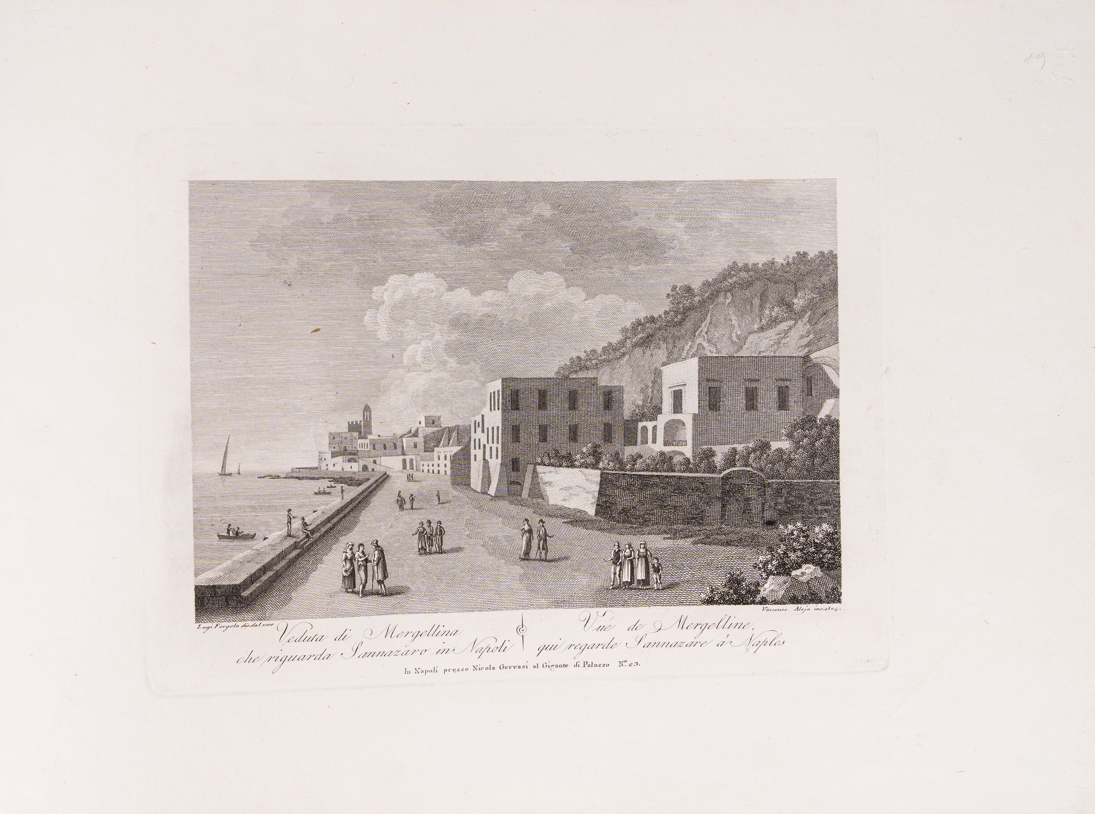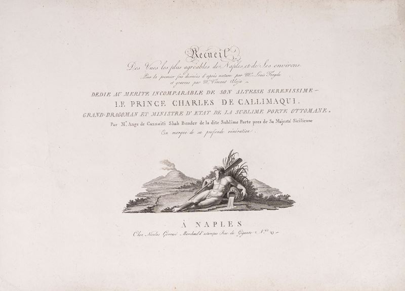 Bellissima raccolta di incisioni di Aloja su disegni dal vero di Fergola, pubblicata dallo stesso Fergola e distribuita da Gervasi. Esemplare singolare perchè parte di una tiratura limitata per Mr. Ange de Cazzaiti Shah Bender, come evidenziato nella dedica inserita al frontespizio e dall'aggiunta di una antiporta su dipinto di Fischett che raffigura la Gloria e un putto che sorregge uno stemma con ai piedi una veduta del Vesuvio.