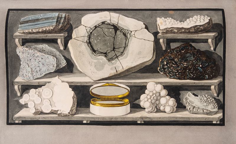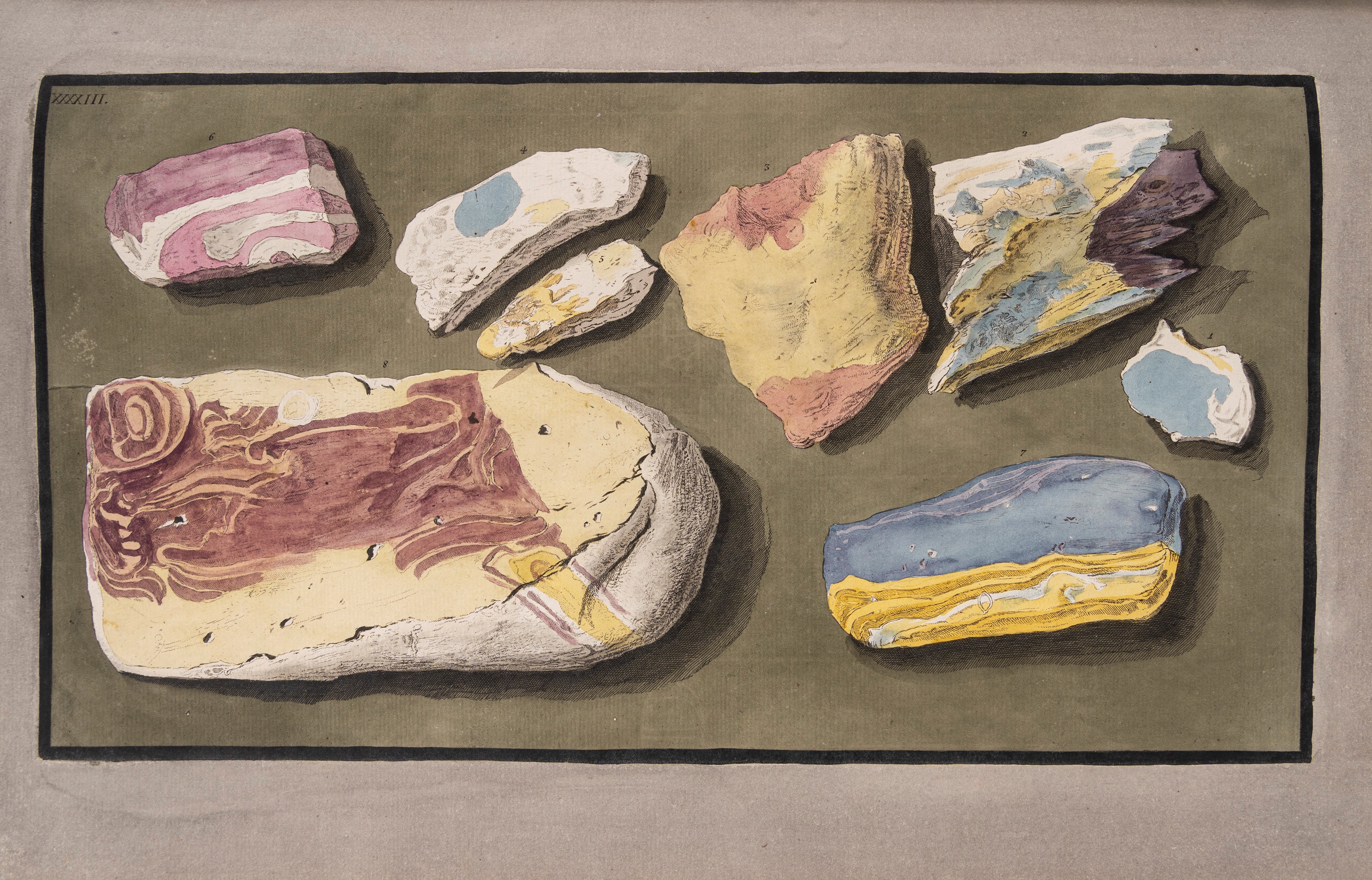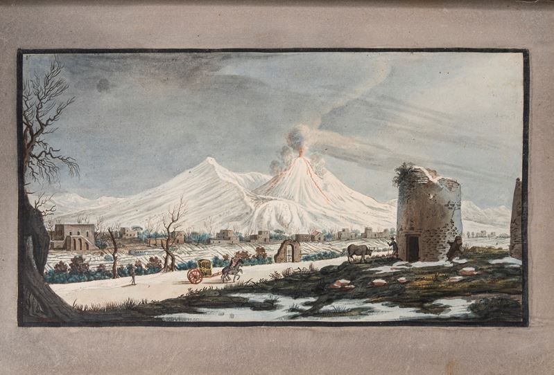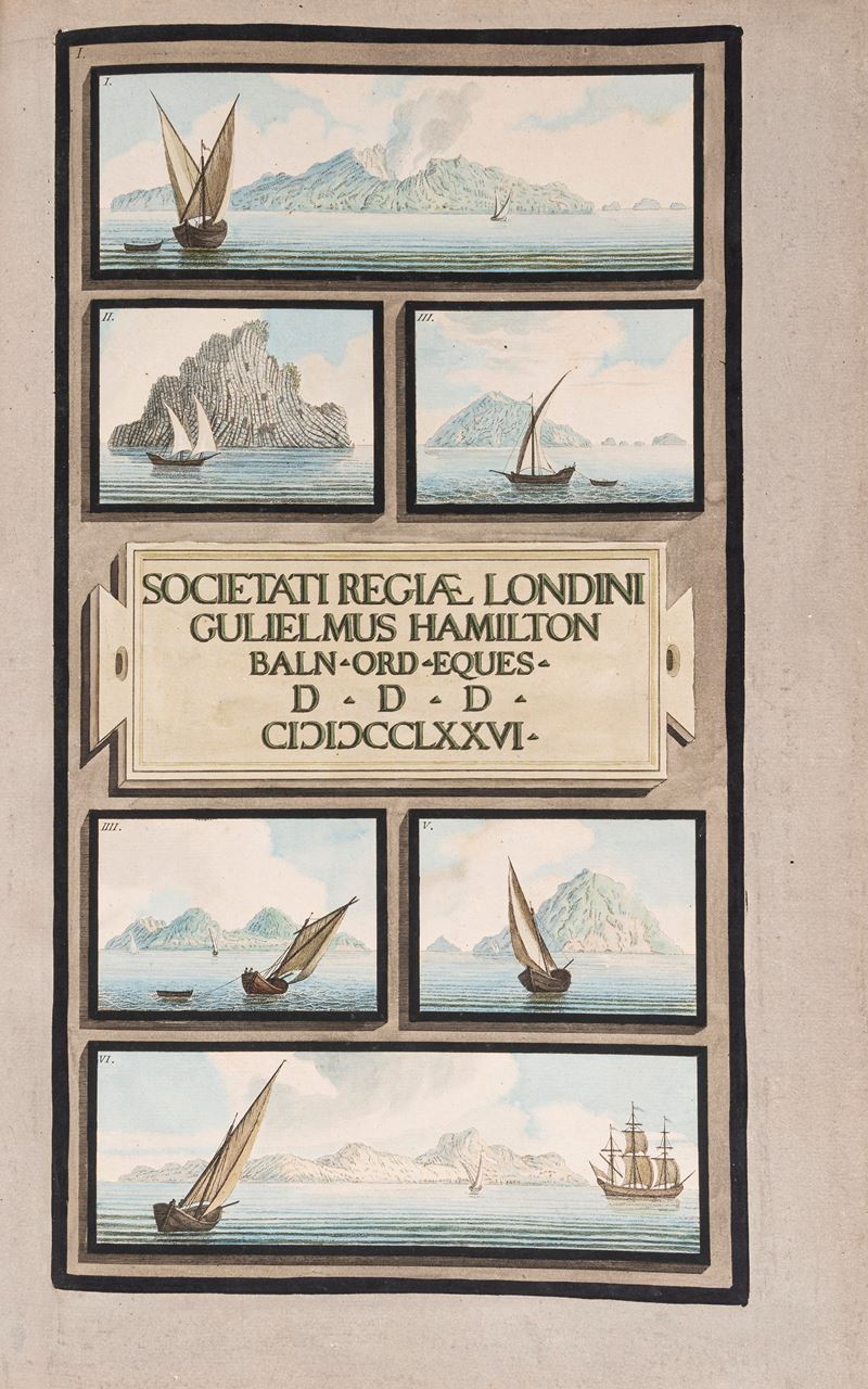 Straordinario è l’apparato iconografico, composto da 59 tavole incise e finemente colorate a mano all’epoca, realizzate su disegni di Pietro Fabris, artista scelto personalmente da Hamilton e da lui ritenuto insuperabile nel coniugare precisione scientifica e qualità estetica. Fabris accompagnò Hamilton nelle sue escursioni e lavorò sotto la sua costante supervisione; i due compaiono spesso nelle vedute intenti a osservare e misurare i fenomeni naturali, riconoscibili dai caratteristici cappotti, rosso per Hamilton e blu per Fabris. Le immagini raffigurano crateri, colate laviche, sezioni geologiche, campioni di rocce, panorami del Golfo di Napoli, Pozzuoli, la Solfatara, Ischia, Stromboli, l’Etna, nonché spettacolari eruzioni diurne e notturne del Vesuvio, culminanti nelle celebri tavole del Supplemento, dedicate all’eruzione del 1779.