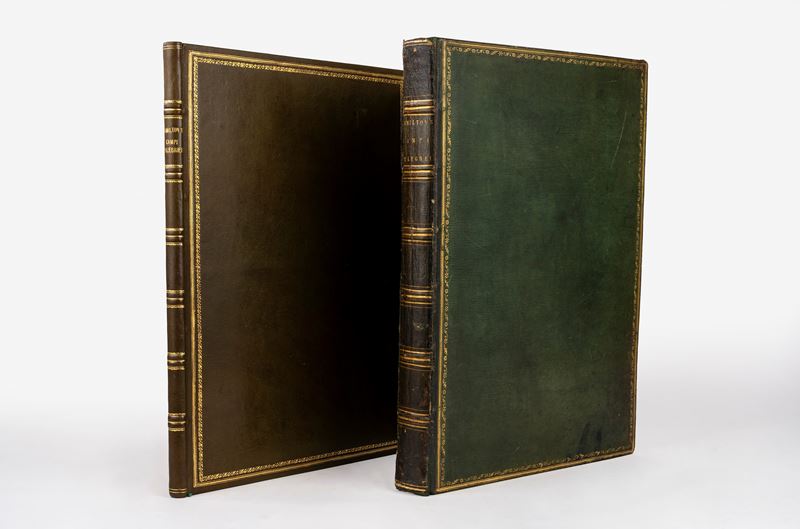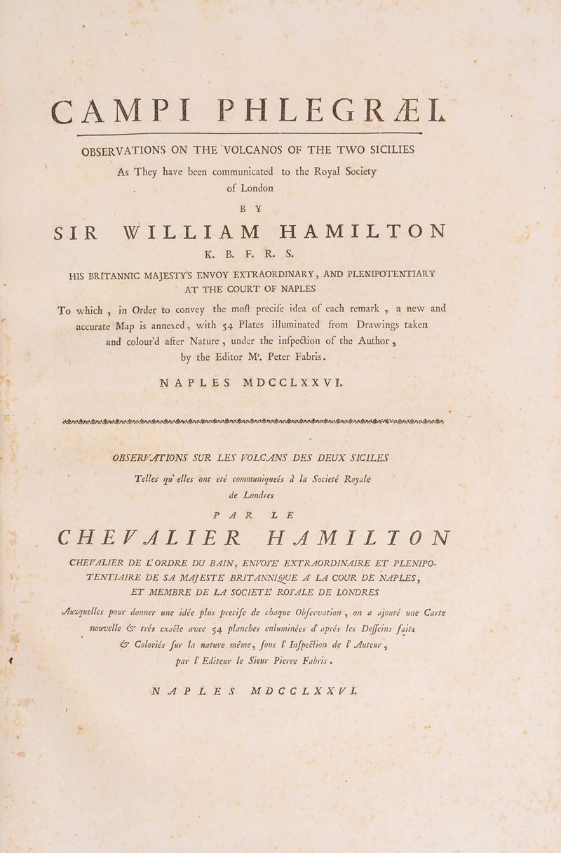 Napoli, [Pietro Fabris], 1776. In 2°. 3 parti in 2 volumi. Un volume di tavole e commento testuale, con antiporta incisa in rame con vedute marine in coloritura coeva, frontespizio stampato, una carta geografica a doppia pagina del Golfo di Napoli incisa da Giuseppe Guerra, 54 tavole a piena pagina con COLORITURA D'EPOCA entro cornice nera e margine grigio incise da Pietro Fabris. Legato con Supplement to the Campi Phlegraei, Napoli, [Pietro Fabris], 1779. Con 5 tavole a piena pagina in coloritura d'epoca entro cornice nera e margine grigio incise da Pietro Fabris. Qualche lievissima arrossatura, legatura in marocchino verde a grana lunga inizio secolo XIX, piatti inquadrati da fregi in oro ai piatti e al dorso, dentelle dorate, titolo in oro al dorso, tagli dorati, lievissimi difetti. Un volume esclusivamente testuale (90,(2) pp.) con l'introduzione all'opera stampata su 2 colonne in inglese e in francese, qualche lievissima arrossatura marginale, legatura in pelle da amatore posteriore con fregi in oro ai piatti e al dorso, dentelle e scritte in oro, tagli dorati, lievissimi difetti. Cofanetto posteriore in marocchino verde e carta marmorizzata.