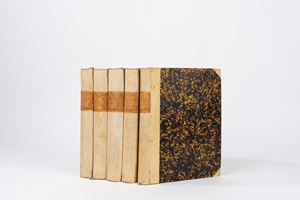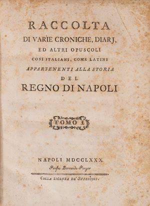Edizione originale, rara a reperirsi completa di tutti i volumi, di quest'ampia raccolta di cronache e diari sulla storia del Regno di Napoli curata da Alessio Aurelio Pelliccia (il cui nome è indicato con le sole iniziali). La raccolta include una varietà di testi, come cronache anonime, diari e altri opuscoli, che forniscono una panoramica sulla storia del Regno di Napoli, sia da un punto di vista generale che locale.