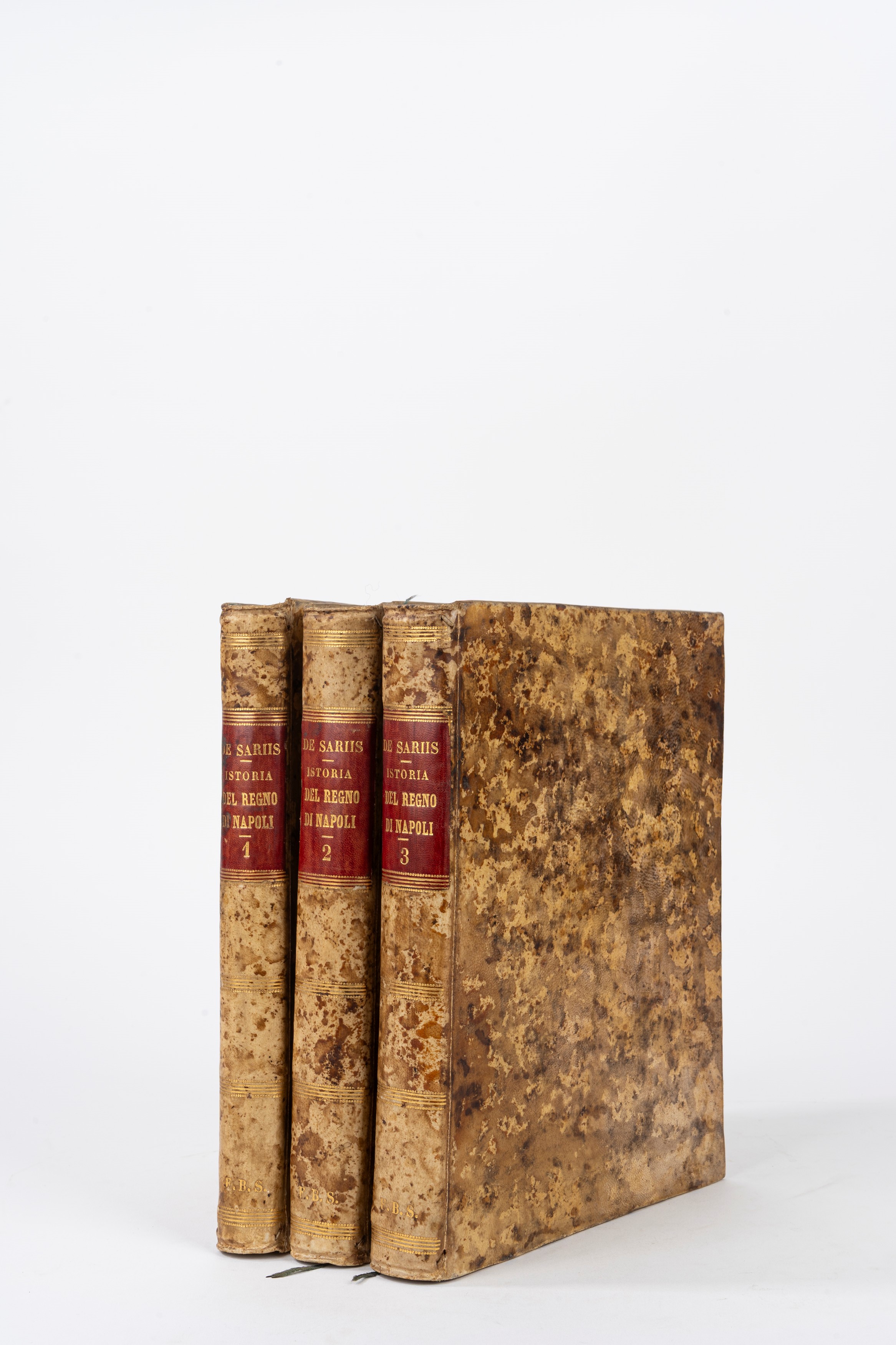 Ricercata prima edizione, rara a trovarsi completa, di questa apprezzata storia del Regno di Napoli dal sec.XV fino all' età contemporanea; nel vol. I troviamo una dettagliata e interessante descrizione della città di Napoli, con tutti gli edifici antichi, lo Stato antico di queste regioni che presero forma di Regno; al vol. II lo Stato medio del Regno. e stato novissimo; al vol. III lo Stato medio del Regno di Napoli. e stato novissimo. De Sariis nacque a Matera nel 1750 e morto nel 1810 ca., fu giureconsulto e storico della Basilicata, Magistrato della Gran Corte della Vicaria di Napoli e, sotto Ferdinando IV di Borbone, governatore regio di San Valentino Torio, Sorrento e Pozzuoli. Il suo nome è legato alla pubblicazione di diverse importanti opere di carattere storico e giuridico.