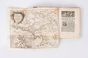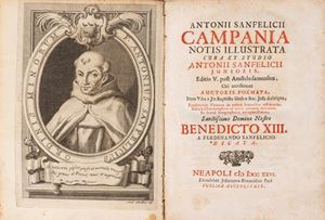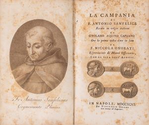 Nel lotto anche la traduzione dell'opera in volgare effettuata da Girolamo Aquino Capuano, La Campania di F.Antonio Sanfelice, Napoli, V. Orsini, 1796. In 8°. Ritratto dell'autore in antiporta e una tavola ripiegata, bruniture diffuse.