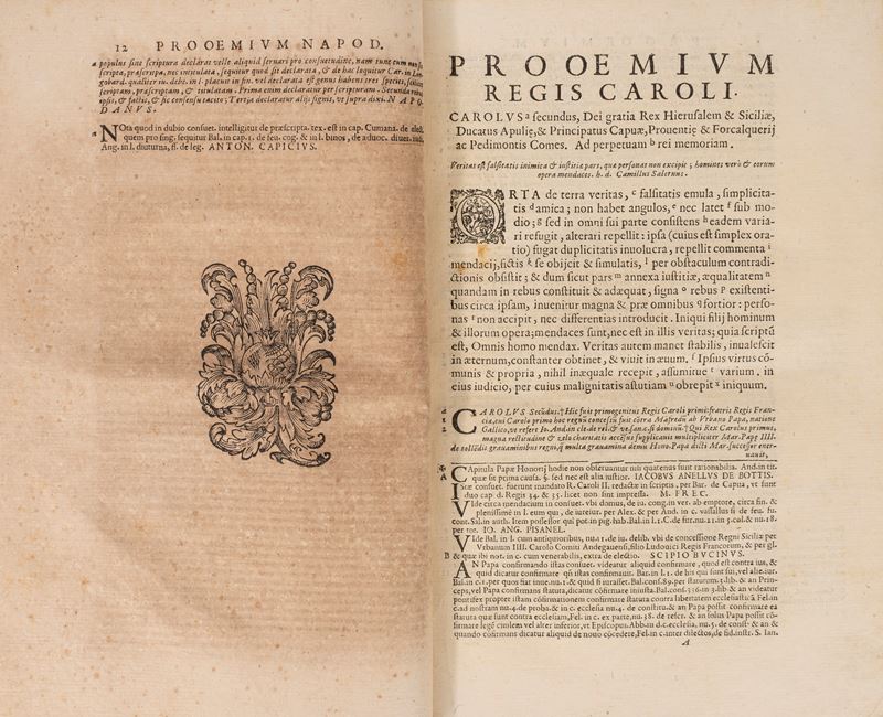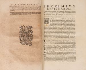 Napoli, Egidio Longo, 1677. In 2°. Frontespizio in rosso e nero, diffuse bruniture. Legato con: Glossographia et scriptiones ad consuetudinis neapolitanas. Napoli, Egidio Longo, 1677. Frontespizio in rosso e nero con marca tipografica, bruniture. Legatura in mezza pelle e percallina del sec.XIX.