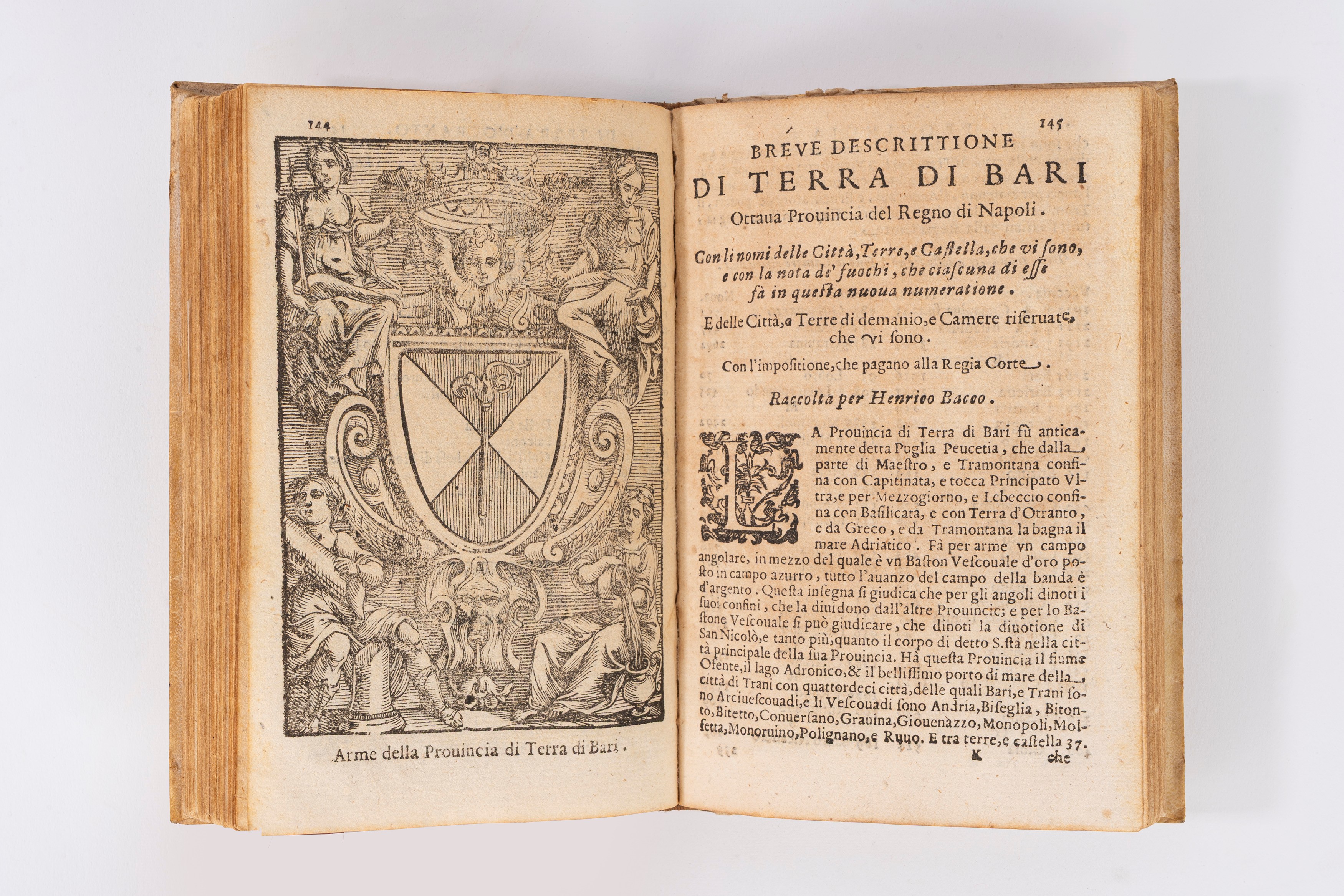 Edizione molto rara di questo trattato araldico che raccoglie gli stemmi delle Provincie e le notizie delle principali famiglie del Regno di Napoli.