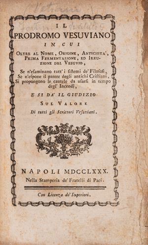 Napoli, Giacomo Raillard, 1705. In 4°. Fregio xilografico al frontespizio, fioriture sparse, qualche carta brunita, legatura coeva in pergamena, titolo manoscritto al dorso, lievi difetti. § Vetrani, Antonio. Il prodromo vesuviano in cui oltre al Nome, Origine, Antichità, Prima Fermentazione ed Irruzione del Vesuvio, Napoli, Stamperia de' Fratelli di Paci, 1780. In 8°. Esemplare in barbe con lievi fioriture sparse, legatura del secolo XX in mezzo marocchino rosso con angoli e carta marmorizzata, titolo in oro al dorso a 4 nervi, lievissimi difetti.