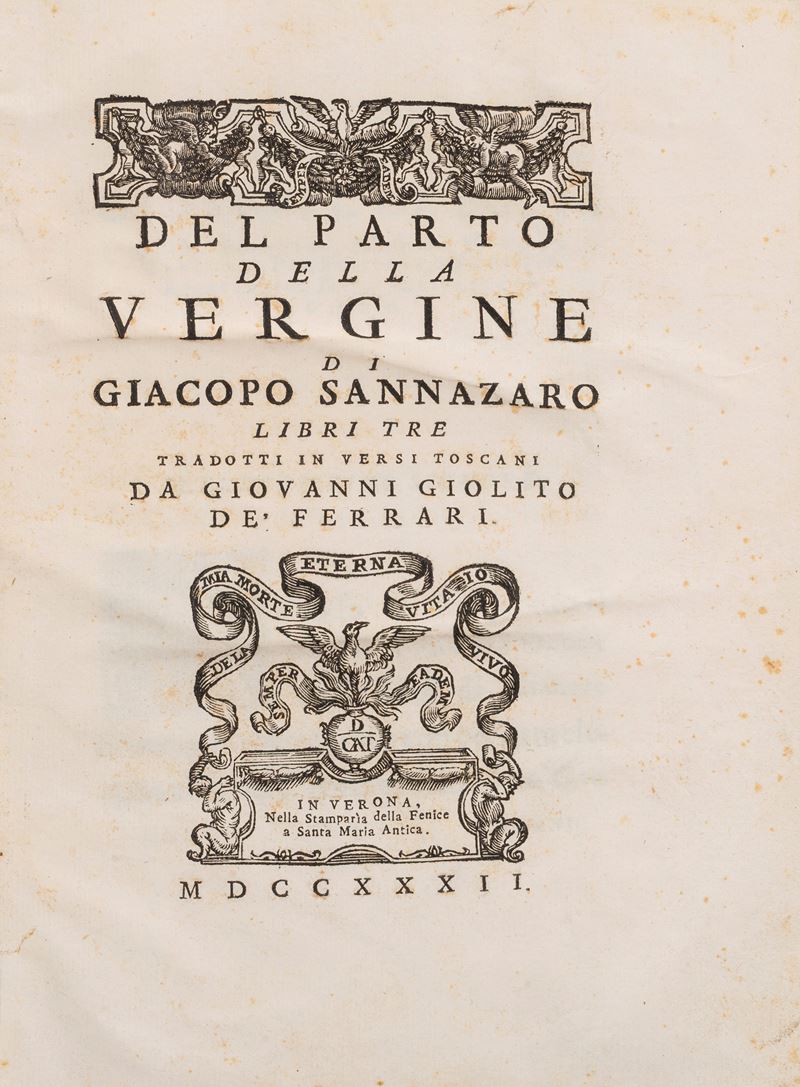 I opera: L’opera è articolata in tre libri, ciascuno introdotto da una splendida illustrazione a piena pagina raffigurante rispettivamente l’Annunciazione, la Visitazione e la Natività. Si tratta della prima edizione della traduzione di Giovanni Giolito dell’opera latina di Jacopo Sannazzaro, celebre poeta e umanista napoletano del Rinascimento italiano. Figura di spicco non solo in ambito letterario, ma anche per il suo ruolo culturale e politico di rilievo: fu segretario e ambasciatore presso diverse corti italiane ed europee, tra cui quella di Federico d’Aragona e del re di Francia Carlo VIII.