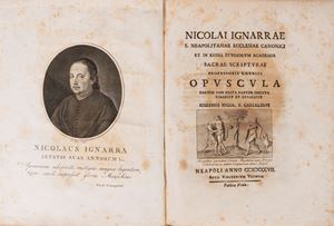 Verona, Stamparia della Fenice, 1732. In 4°. Fregi xilografici, lievissimi difetti, rinforzo al margine interno di p. 11, legatura coeva in cartoncino. § Ignarra, Nicolò, Opuscula partim iam edita, partim inedita, Napoli, Vincentium Ursinum, 1803. In 4°. Ritratto dell'Autore in antiporta, vignetta in rame al frontespizio, esemplare in barbe, qualche lieve fioritura, legatura coeva in pergamena rigida, titolo in oro entro al dorso liscio, lievissimi difetti.