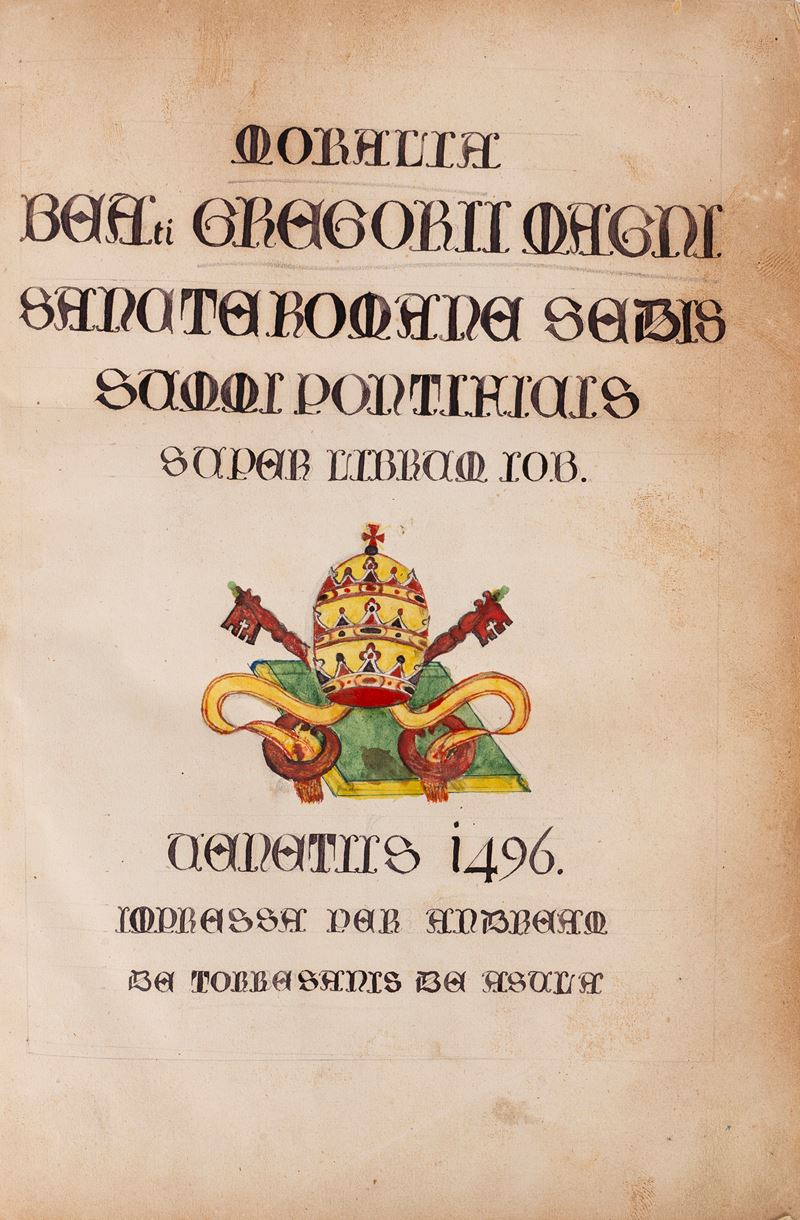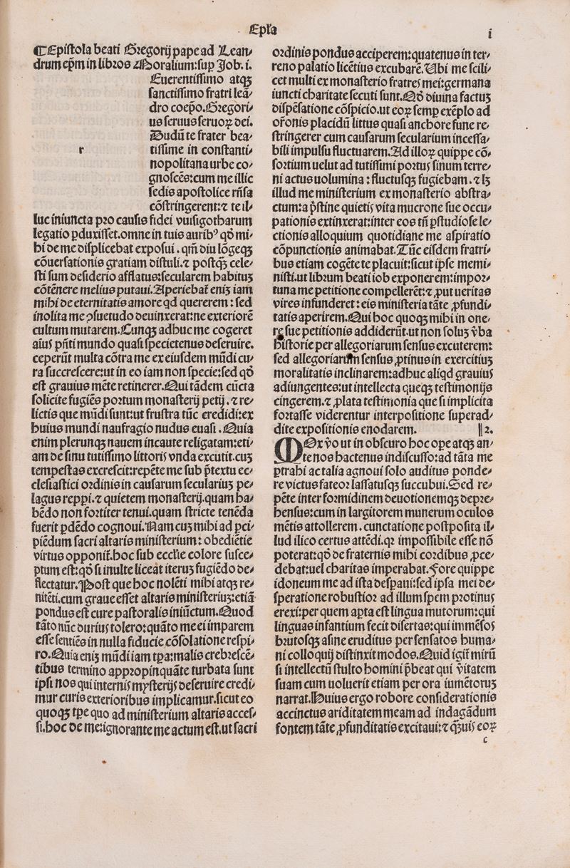 Edizione stampata in elegante carattere gotico, fu giudicata di altissimo valore dai bibliografi, e fu realizzata da Torresani due anni dopo che Aldo Manuzio aveva lasciato la tipografia per fondare la propria.Gregorio Magno (504-604 d.C.), appartenente a una nobile famiglia romana, fu prefetto di Roma prima di consacrarsi alla vita religiosa. Pur incline alla meditazione monastica, venne eletto Papa grazie alle sue qualità diplomatiche e amministrative. È ricordato soprattutto per aver promosso la prima missione cristiana in Gran Bretagna, guidata da Agostino di Canterbury, con lo scopo di convertire gli anglosassoni.La sua opera principale, il Moralia, iniziata durante la sua permanenza alla corte di Tiberio II a Costantinopoli e completata dopo l’elezione a pontefice, è un ampio commento al libro di Giobbe ed è considerato uno dei testi teologici più vasti dell’Occidente.