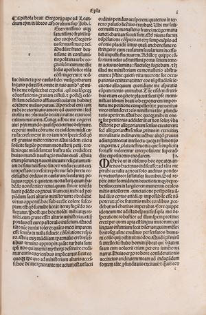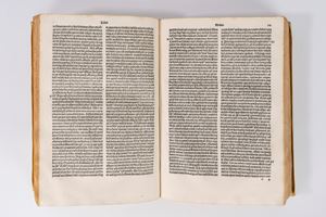 Venezia, impressa per Andream Torresanis de Asula: Anno domini 1496 xi mensis aprilis. In 2°. La prima carta (a1) sostituita con foglio manoscritto con stemma papale a colori, mancanti a4-5, alcuni fori di tarlo, lieve gora d'acqua negli ultimi fascicoli, lievi fioriture, legatura di epoca successiva in pergamena rigida, titolo in oro entro tassello al dorso.