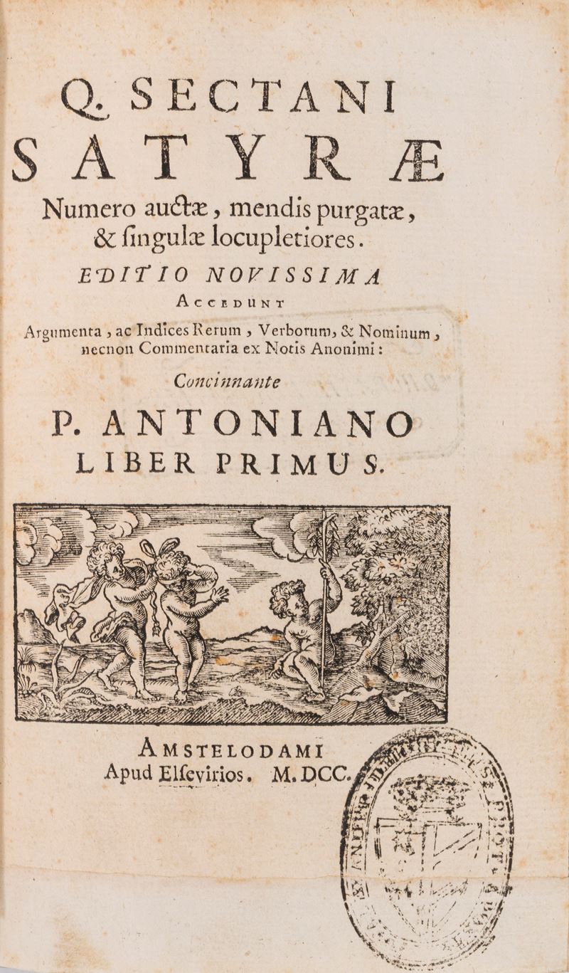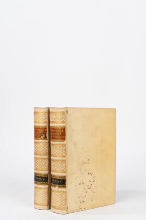 Amsterdam, Elzevier, 1700. In 8°. 2 voll. Vignetta xilografica al frontespizio, illustrazioni, testatine e finalini xilografici, lievi fioriture e bruniture marginali, legatura in pergamena con titolo impresso in oro entro tassello al dorso, leggeri aloni, alcuni fori di tarlo, tagli blu. Timbro di appartenenza al frontespizio con stemma e iscrizione Alexander De Horatiis Prot. Apost.