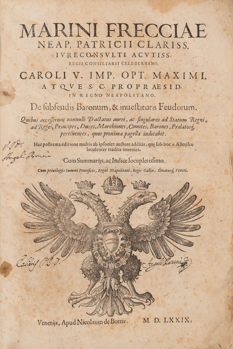 Venezia, apud Nicolaum de Bottis, 1579. In 2°. Grande stemma con aquila bicipite al frontespizio, riconducibile all'Imperatore Carlo V, capilettera abitati, fioriture e arrossature, legatura in pergamena floscia coeva. Note di possesso manoscritte al frontespizio, leggibile un Angelo Bruni.