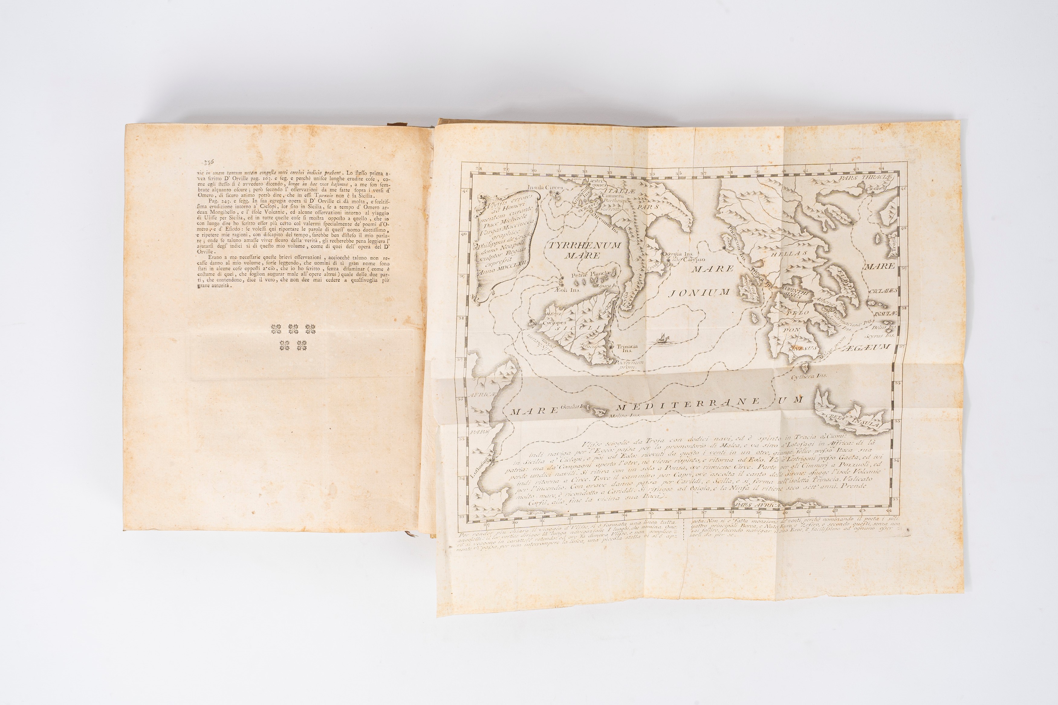 Napoli, Presso i Fratelli Simoni, 1764. In 4°. 2 voll. Una tavola ripiegata con mappa del Mediterraneo, alcune figure nel testo, testatine e capilettera, lievi fioriture altrimenti esemplare perfetto, legatura coeva in piena pergamena, tagli a spruzzo.