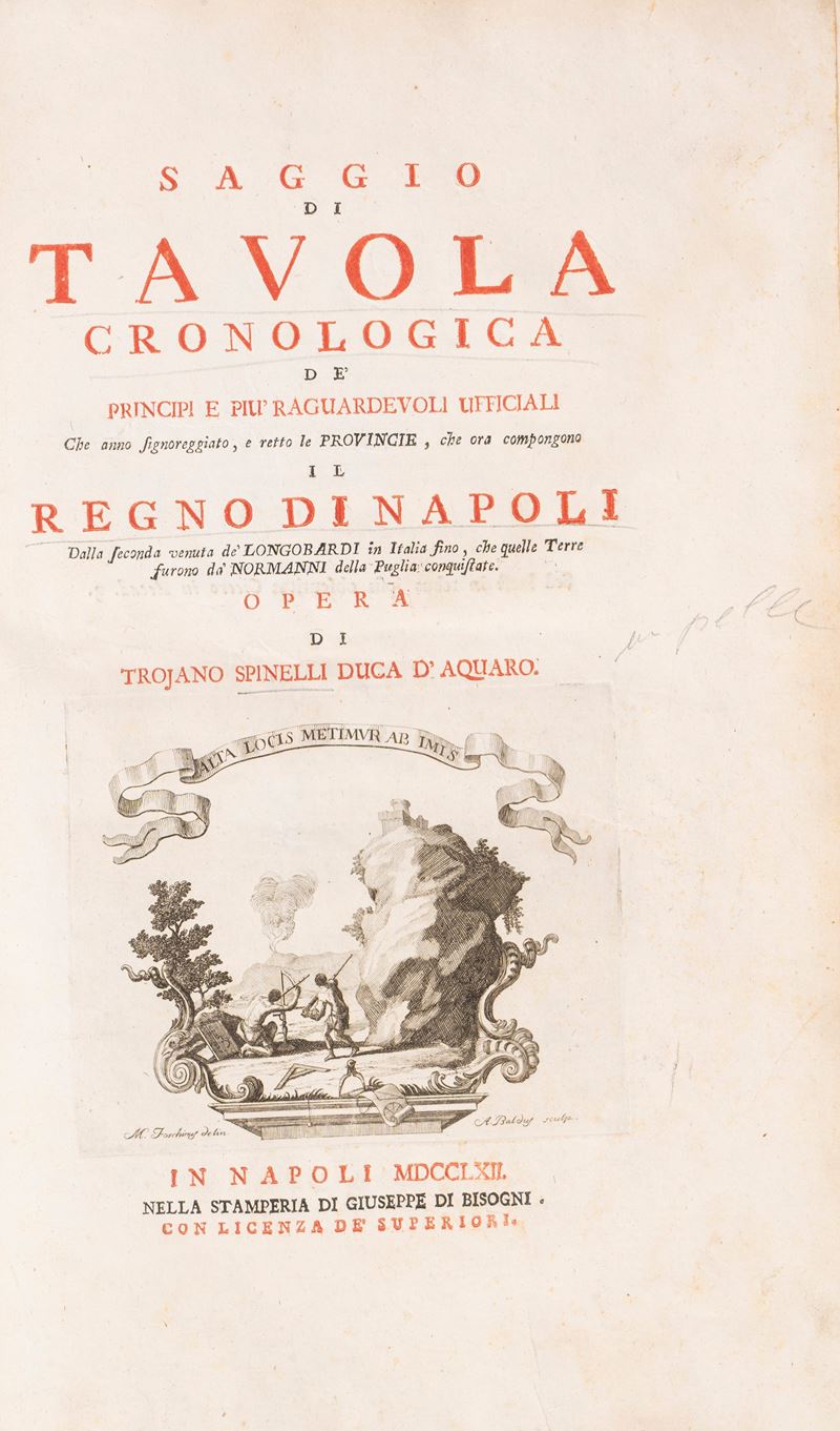 Napoli, nella stamperia di Giuseppe Di Bisogni, 1762. In 2°. Vignetta calcografica incisa da Antonio Baldi su frontespizio in rosso e nero, a c. a1r testatina calcografica incisa da Giuseppe Aloja, marginali fioriture altrimenti ottimo esemplare, legatura in mezza pelle bordeaux e tela rossa.