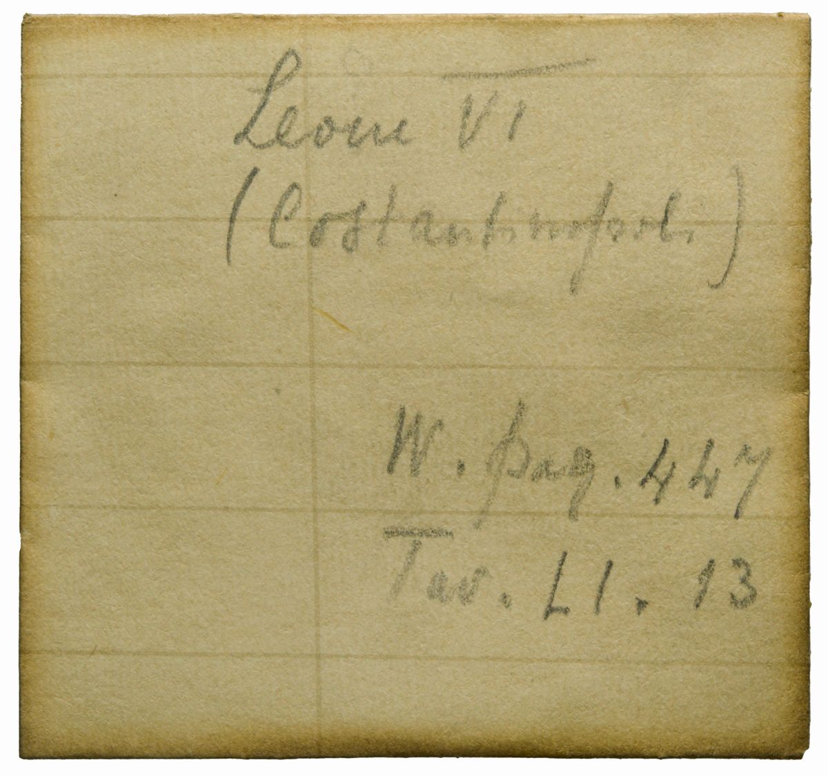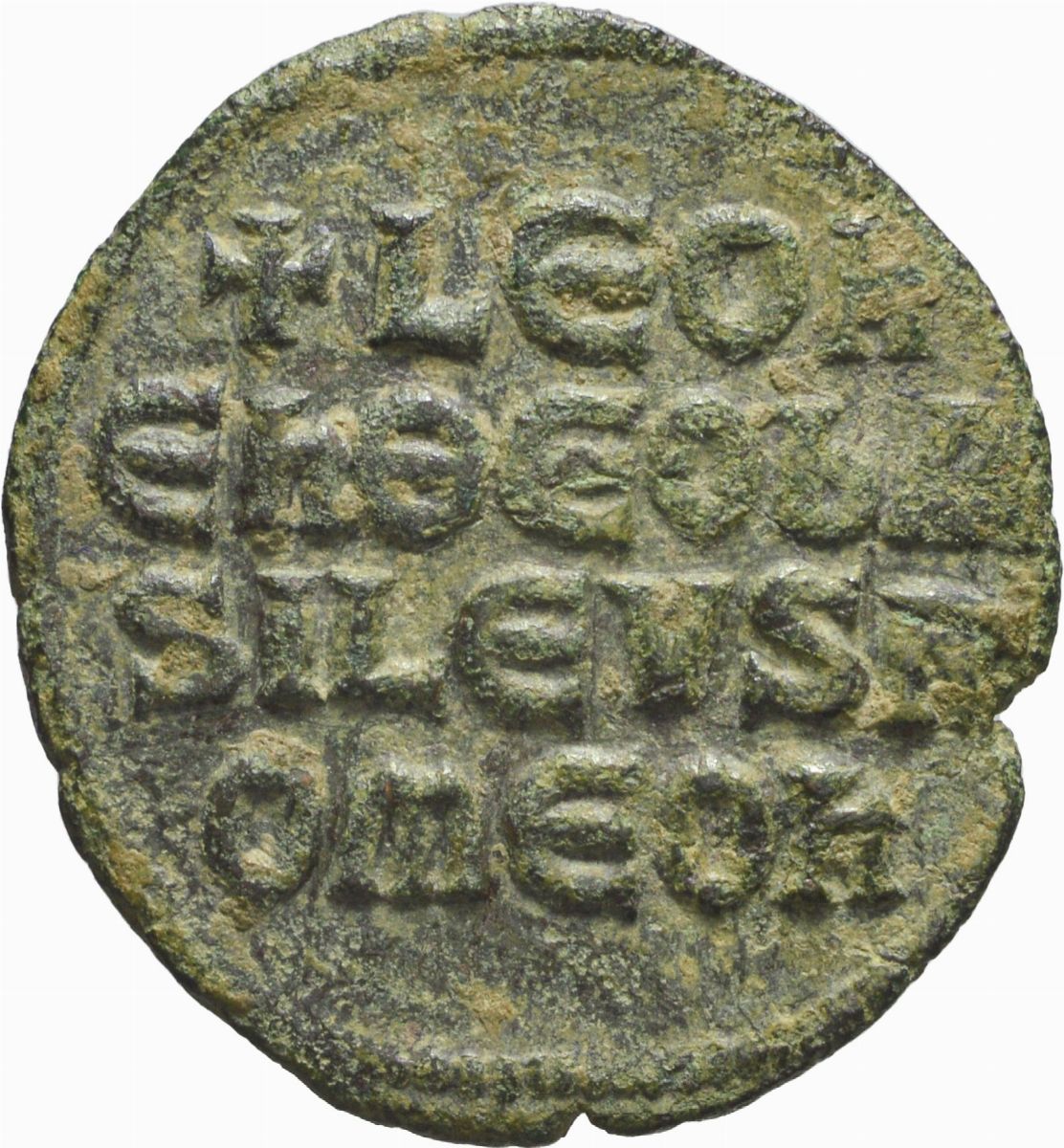 D/ LEON BASILEVS ROM, busto frontale coronato, tiene l'akakia nella sinistra, R/ LEON EN THEOS BASILEVS ROMEON, Zecca di Costantinopoli, Rif. bibl. Sear, 1729; D.O., 8; Metallo: AE, gr. 5,17, Diam.: mm. 28,46