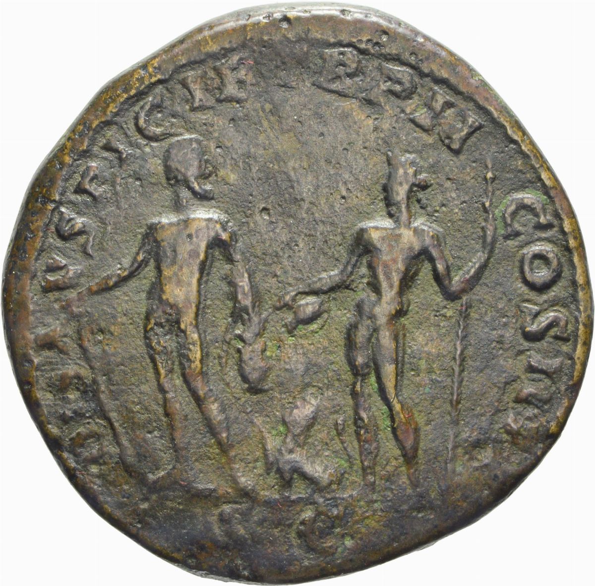 D/ L SEPT SEV PERT AVG IMP III, busto laureato con corazza a destra, R/ DIS AVSPICIB TR P II COS II P P, S C, Ercole con leontè e clava e Bacco con coppa e tirso stanti uno accanto all’altro, Zecca di Roma, Rif. bibl. R.I.C. 669/R2; Cohen 119; Metallo: AE, gr. 29,24, Diam.: mm. 32,65. BB