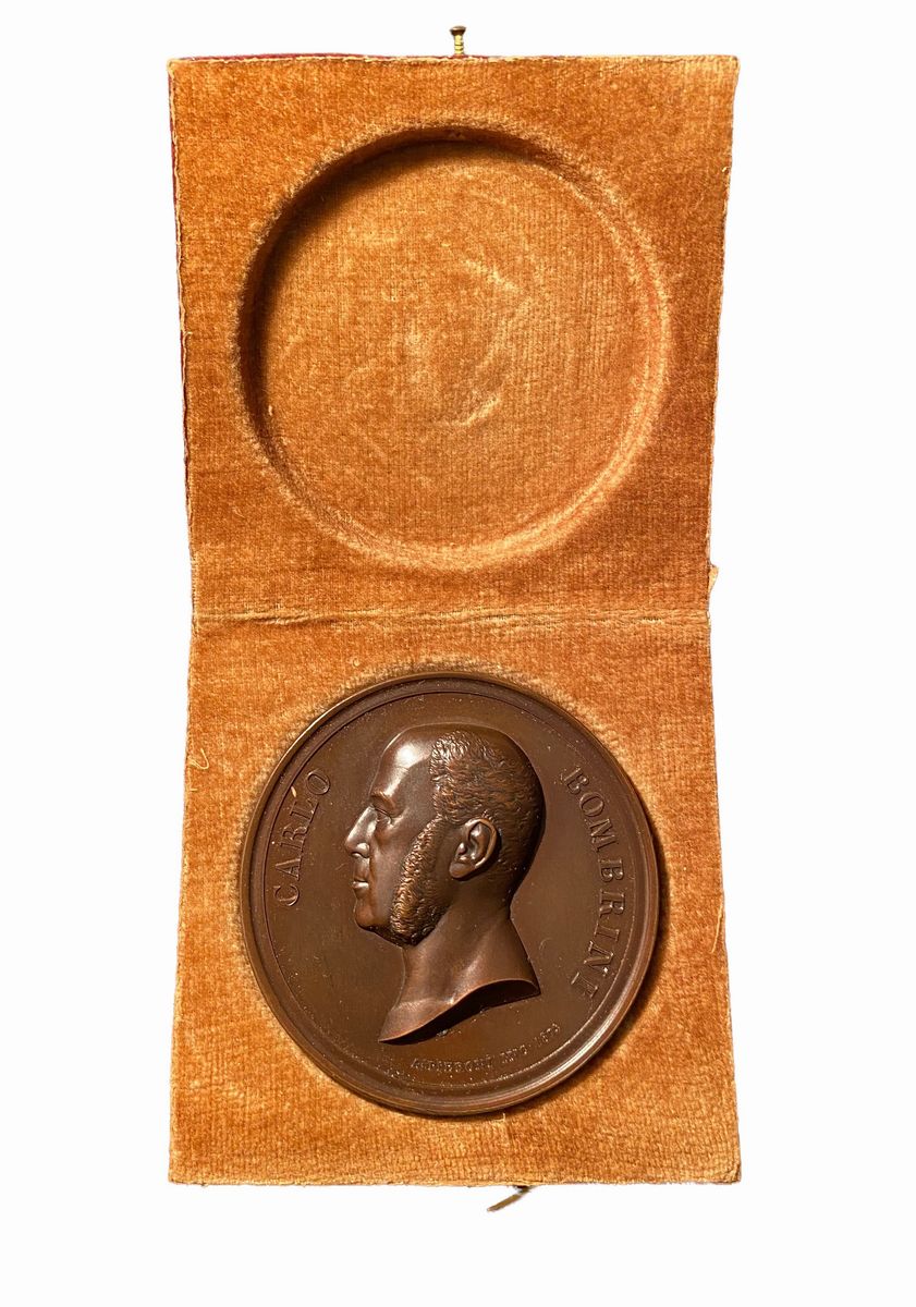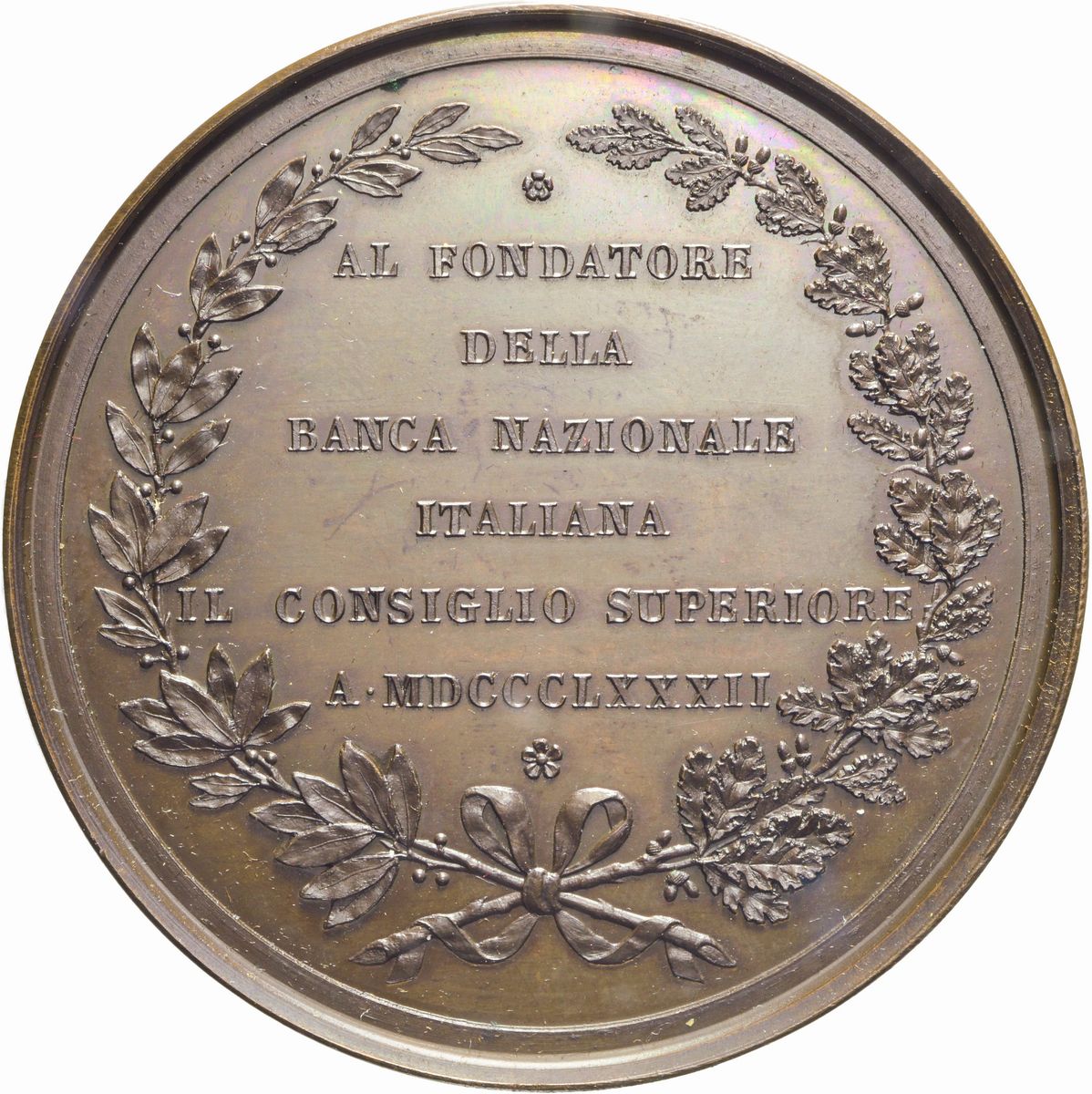 D/ busto a sinistra, R/ nel campo, entro rami d'alloro e quercia legati da nastro, in basso: *AL FONDATORE DELLA BANCA NAZIONALE ITALIANA IL CONSIGLIO SUPERIORE A MDCCCLXXXII *, medaglista: Pieroni Adolfo, Metallo: AE, gr. 57,12, Diam.: mm. 49,29. La medaglia coniata, realizzata nel 1882, a ricordo di Carlo Bombrini (1804-1882) banchiere, fondatore della Cassa di Genova e della Banca Nazionale; fu senatore del Regno, eletto nel 1871. SPL. Con cofanetto