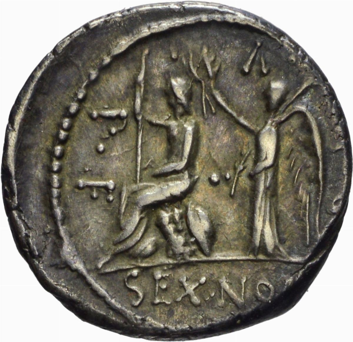D/ testa di Saturno a destra, R/ Roma seduta su scudi a sinistra viene coronata dalla Vittoria, Zecca di Roma, Rif. bibl. Craw, 421/1; babelon 1, Sydenham 885; Metallo: AR, gr. 3,98 Diam.: mm. 17,70. mBB