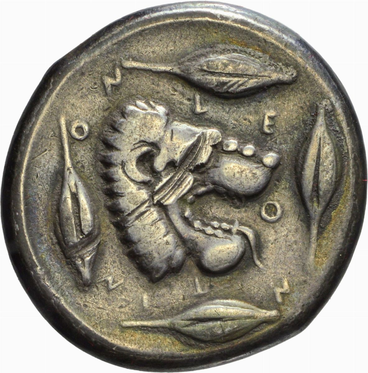 D/ testa laureata di Apollo a destra, R/ testa di leone a destra attorniata da quattro chicchi di orzo, Zecca di Leontini, Rif. Buceti 18/R3; Metallo: AR, gr. 16,75, Diam.: mm. 24,42. MB