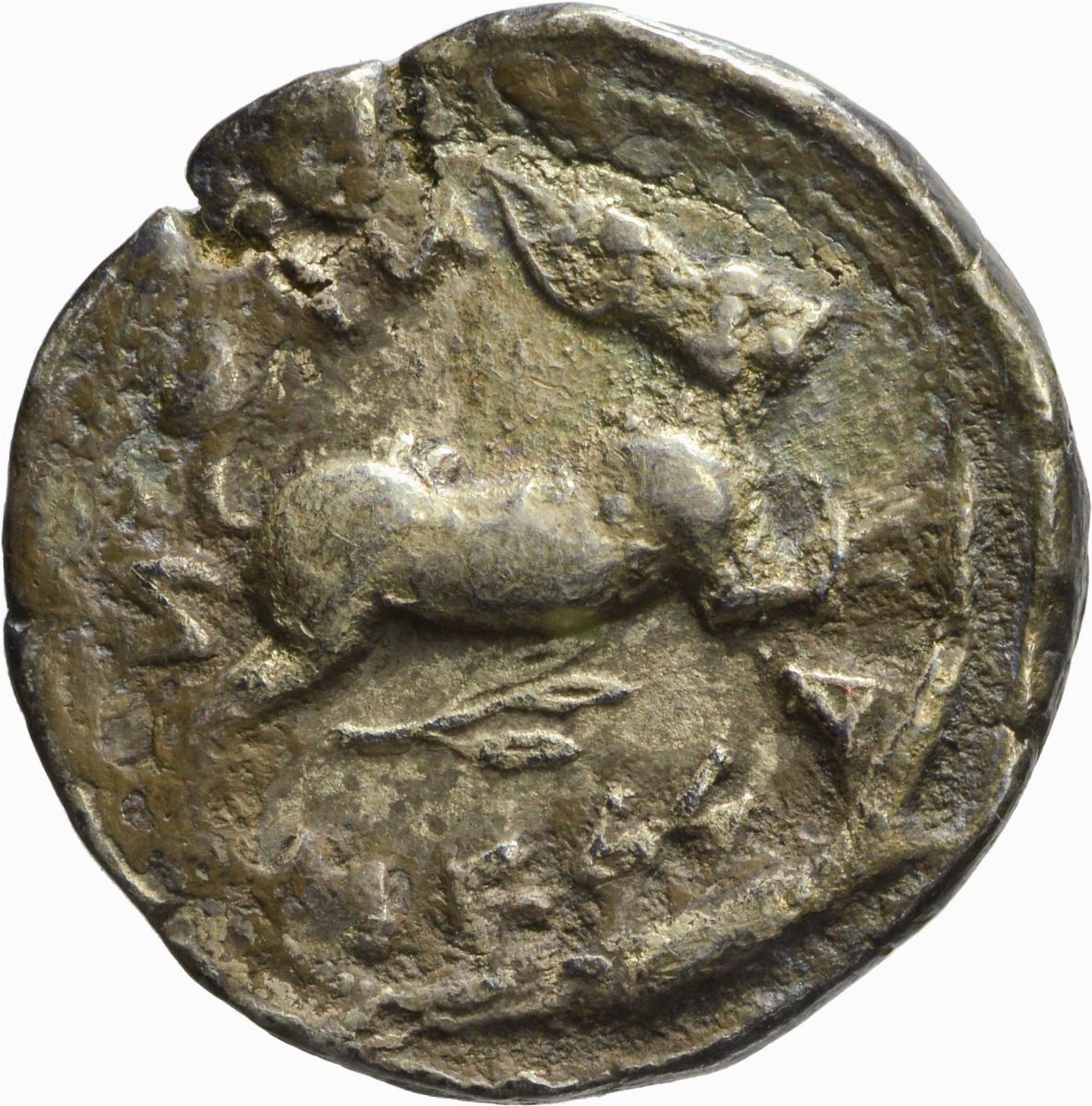 D/ auriga su biga di mule a destra; in esergo foglia di alloro, R/ lepre in corsa a destra; sotto un ramoscello di ulivo, Zecca di Messana, Rif. Buceti 40/R3; Metallo: AR, gr. 17,29, Diam.: mm. 27,02. MB