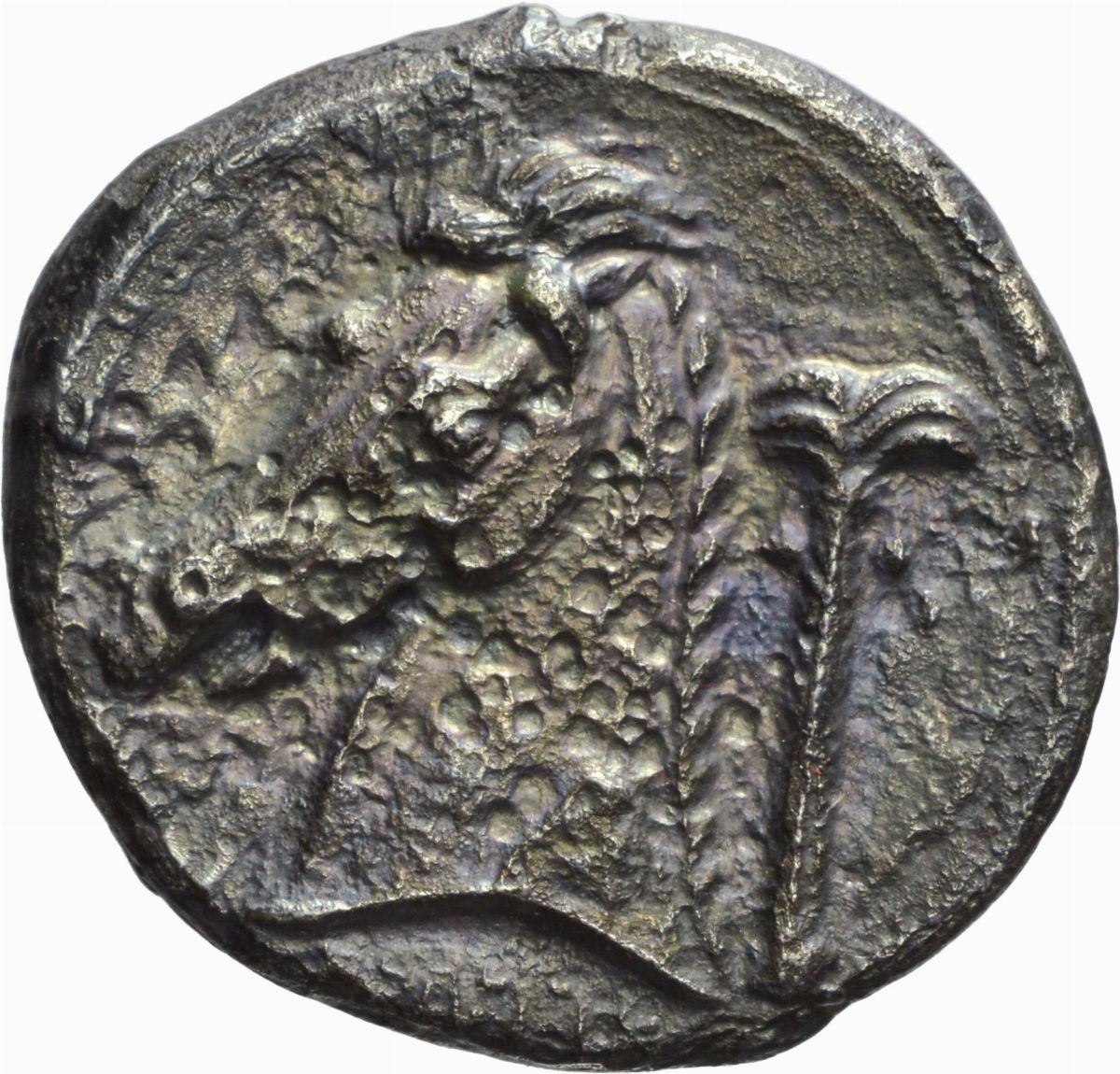 D/ testa Aretusa a sinistra, intorno delfini, R/ testa di cavallo a sinistra, dietro palma; Rif: Sng Dan. 981, Pozzi 3301, Metallo: AR, gr. 16,03, Diam.: mm. 27,68. qBB