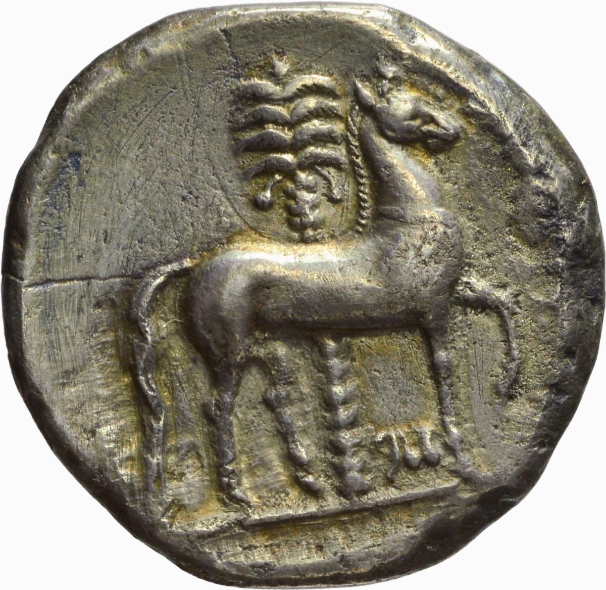 D/ testa Aretusa a destra, davanti thymiaterion, intorno delfini, R/ cavallo a destra, dietro palma; Rif: Gulbenkian 367, Metallo: AR, gr. 15,90, Diam.: mm. 25,61. qBB