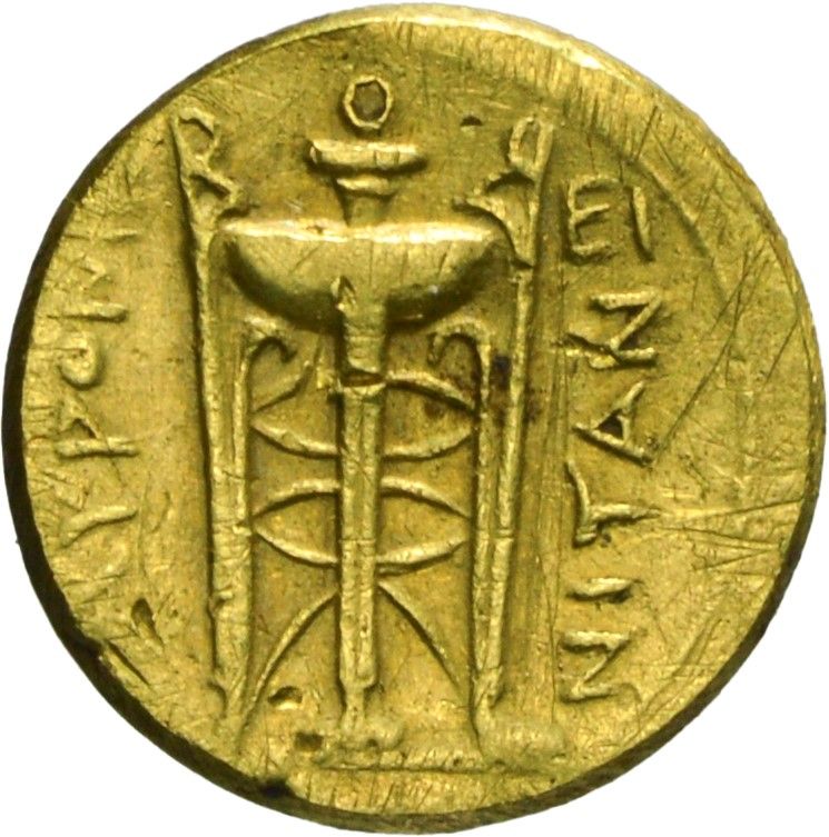 D/ testa laureata a sinistra di Apollo, R/ tripode, Zecca di Tauromenion, Rif. Buceti 18/R2; Metallo: AV, gr. 1,73, Diam.: mm. 10,93. BB