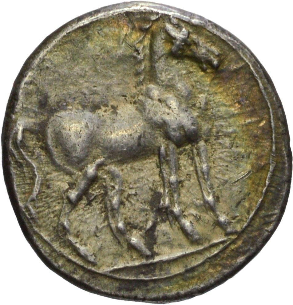 D/ Testa coronata di Tanit a sinistra, R/ Cavallo stante a destra, Zecca di Cartagine, Metallo: AR, gr. 1,88, Diam.: mm. 14,26. mBB