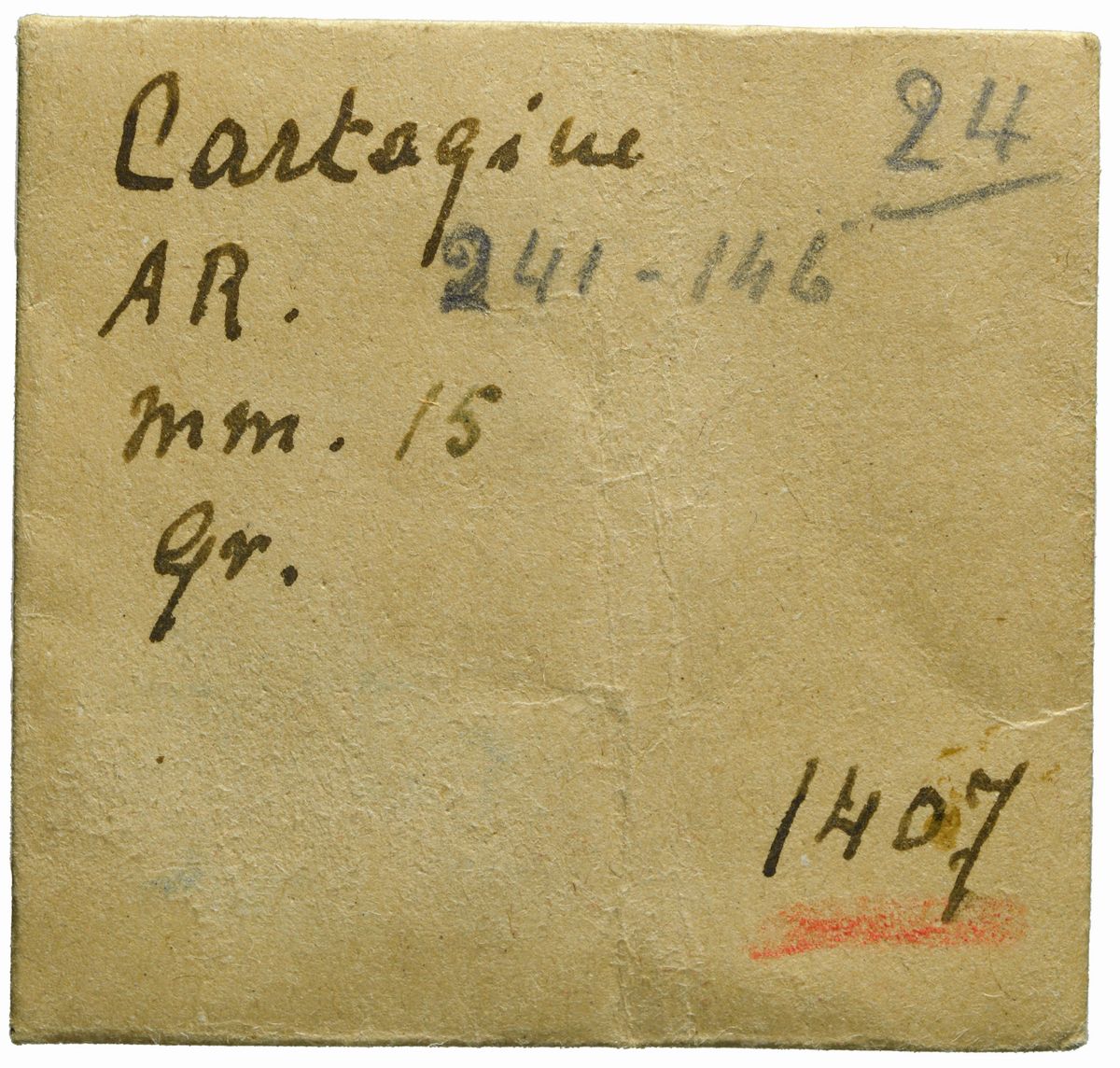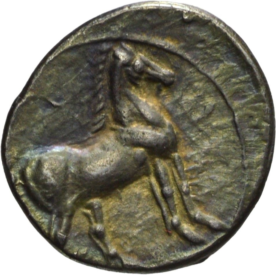 D/ Testa coronata di Tanit a sinistra, R/ Cavallo stante a destra, Zecca di Cartagine, Metallo: AR, gr. 1,68, Diam.: mm. 14,17. qSPL
