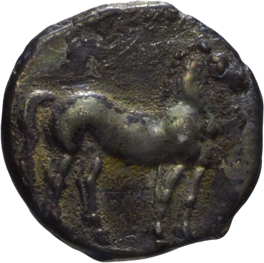 D/ Testa coronata di Tanit a sinistra, R/ Cavallo stante a destra, Zecca di Cartagine, Metallo: AR, gr. 1,79, Diam.: mm. 15,36. mBB