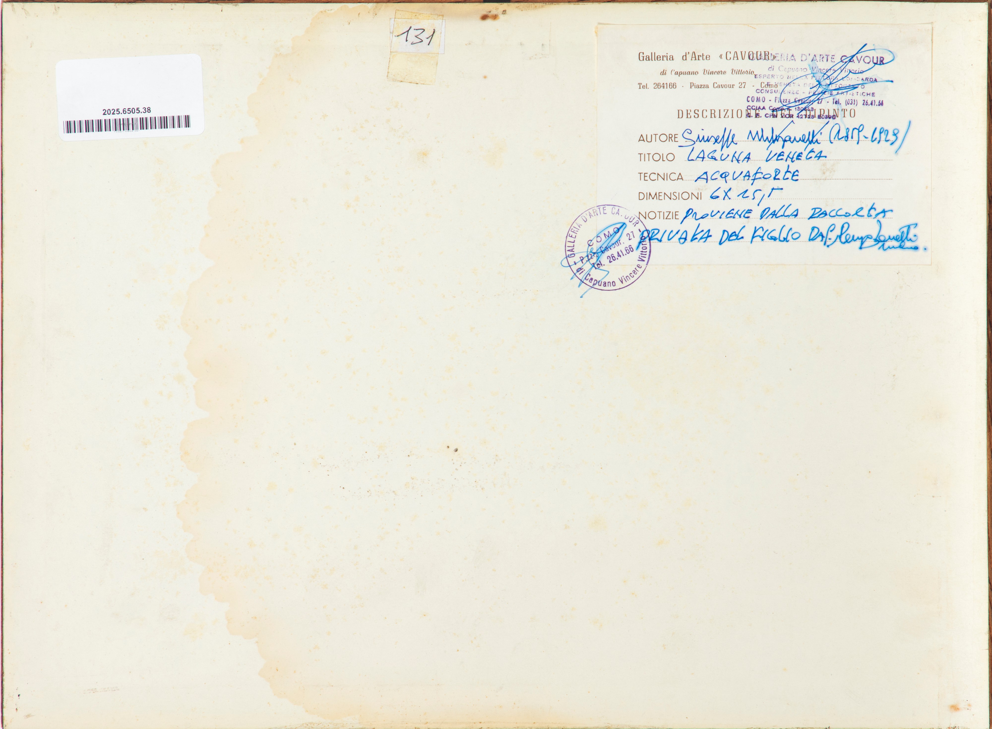 al retro, etichetta e timbro della Galleria Cavour di Como