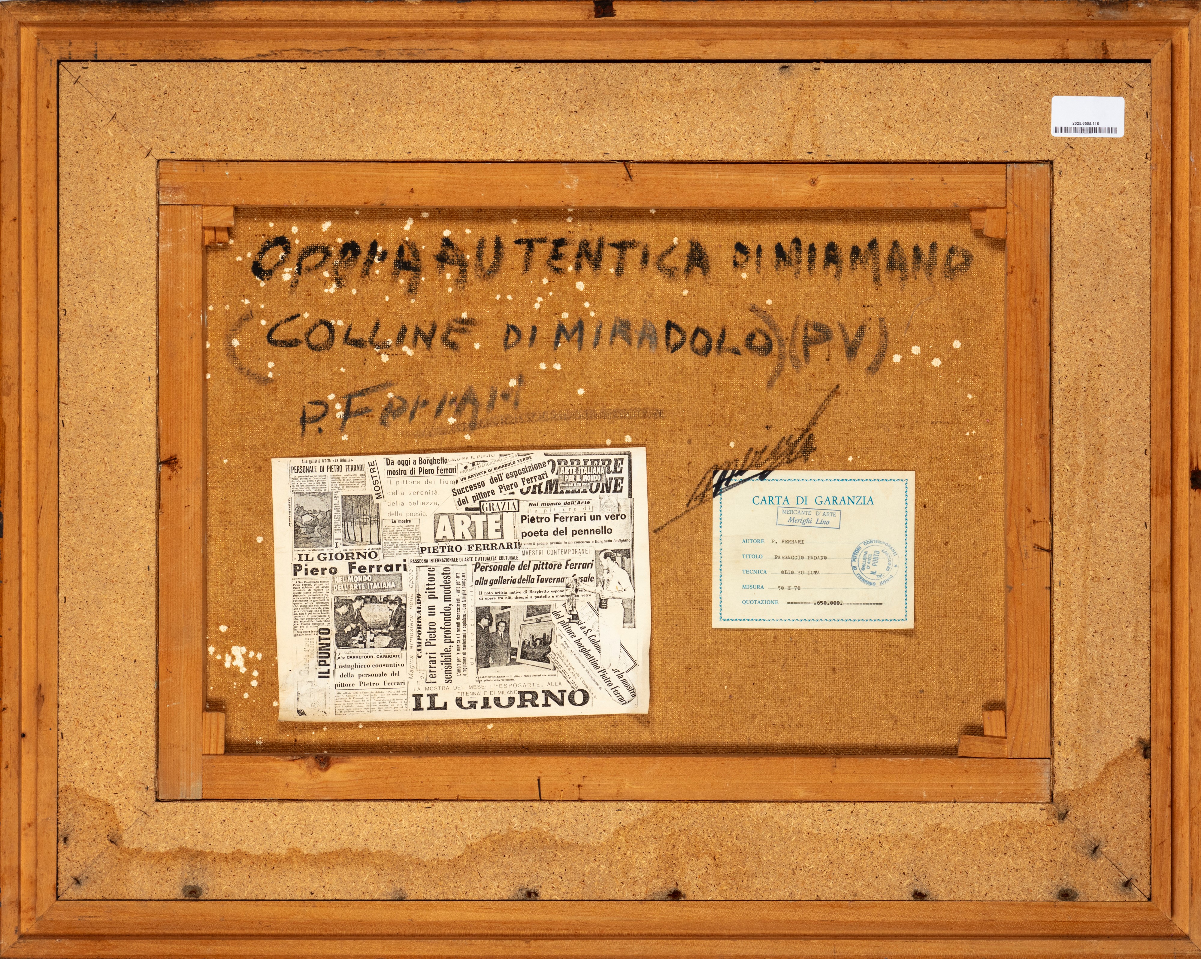 al retro firmato, titolato e autenticato dal pittore