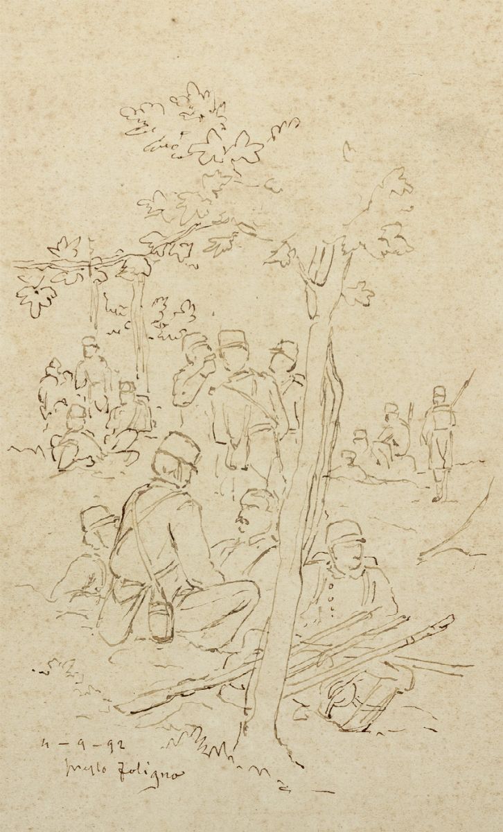 Il foglio fa parte di una serie di quattro raffinati disegni a china raffiguranti soldati accampati a Torre di Montefalco, località nei pressi di Foligno, eseguiti nel 1892. In questo delle Grandi manovre due gruppi di soldati a cavallo si avvicinano alla grande torre medievale che dà il nome al luogo, presidiata da una guardia armata e da una guardia a cavallo, con una lunga scala appoggiata sulla facciata principale. Sono fedelmente rappresentati due lati della torre a pianta quadrata, con la copertura a beccatelli e caditoie o “piombate” e il moncone di casamatta sommitale, che s’intravede oltre le sagome di quattro militari armeggianti intorno a un cannocchiale d’avvistamento. Scultore, pittore dal 1870 al seguito di Onorato Carlandi e poi cofondatore de "I XXV della Campagna Romana", deputato dell'estrema sinistra radicale dal 1882 al 1892, consigliere del Comune di Roma (1877-1907), iniziato in massoneria sin dal 1881 fino a divenire Gran Maestro del Grande Oriente d'Italia (1904-1917), direttore del Museo Artistico Industriale, membro di molte società e associazioni artistiche e circoli repubblicani, Ettore Ferrari fu personalità tra le più complesse del milieu culturale e politico italiano a cavallo tra Ottocento e Novecento. Il disegno Grandi manovre attesta il suo stretto rapporto con l’Umbria, documentato altresì dalla sua elezione a deputato nel 1882, nel collegio di Spoleto, collegio che lo confermò per le due legislature successive, nel 1886 e nel 1890. Il suo unico intervento parlamentare durante la XV legislatura, del resto, si scagliava contro la rimozione di una lapide a Garibaldi decisa dalle autorità di Foligno. Repubblicano, mazziniano, democratico, anticlericale, anticolonialista ma interventista convinto, Ferrari agli esordi e per tutti gli anni Settanta sperimentò una sorta di romanticismo storico personalizzato dall’uso del lessico barocco, prediligendo il tema del ribelle. Nello stesso anno della vittoria del primo premio all’Esposizione nazionale di Torino del 1880 con il gruppo Cum Spartaco pugnavit, vinse il concorso per il monumento equestre a Vittorio Emanuele II a Venezia, divenendo da lì in poi uno dei maggiori autori di monumenti pubblici a uomini politici ed eroi del Risorgimento in tutt’Italia. I monumenti a cui è legata la sua fama sono il monumento a Mazzini sull'Aventino, inaugurato postumo a vent'anni di distanza senza ricordarne l'artefice, e il Giordano Bruno di Campo de' Fiori (1887-89), monumento per eccellenza dell’anticlericalismo italiano che fu oggetto di aspre polemiche. Ferrari dovette infatti modificare il primo bozzetto del Bruno col braccio alzato che incita alla rivolta, bocciato dal Consiglio comunale, in favore di un severo ‘Bruno filosofo’.