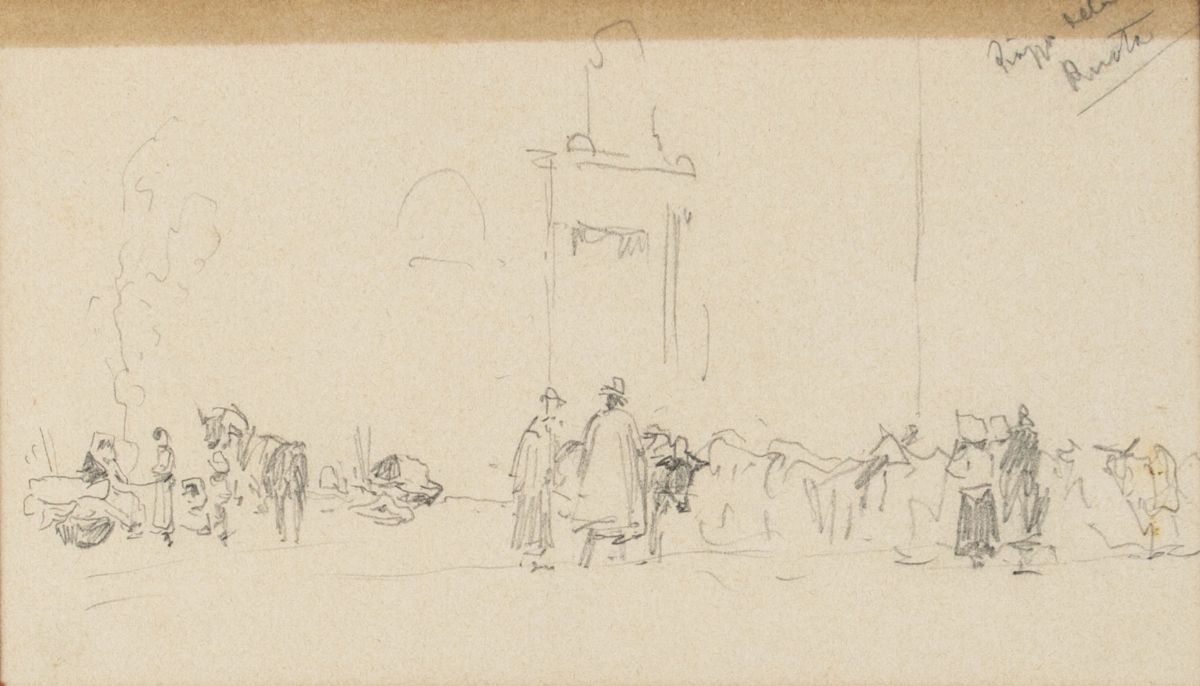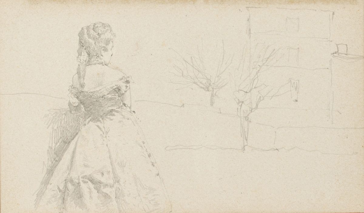 b) Giovane donna elegante di spalle nei pressi di un caseggiato