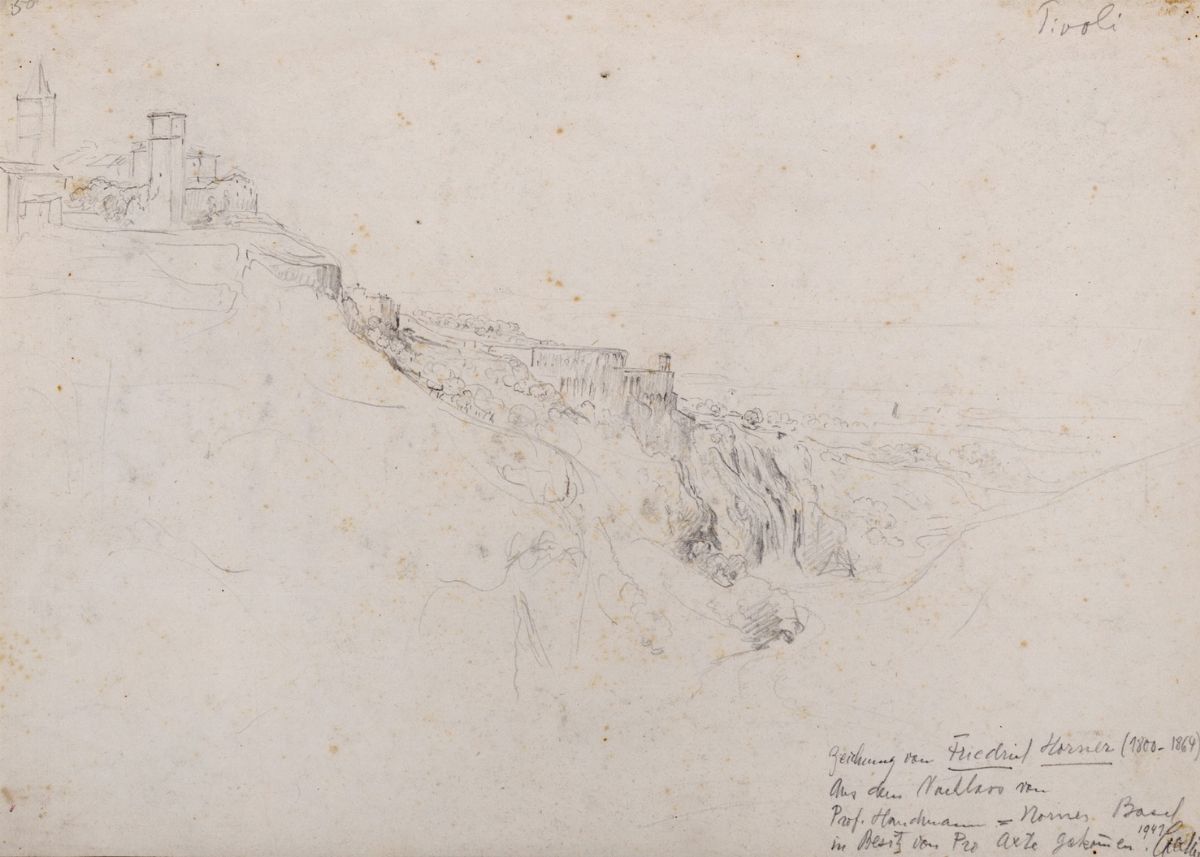 Sul retro: altro disegno di mano dell'artista raffigurante una veduta di Tivoli e della sua valle; numerato 50 in alto a sinistra e intitolato Tivoli in alto a destra; in basso a destra, scritta in tedesco con riferimenti al pittore e alla provenienza dell'opera.