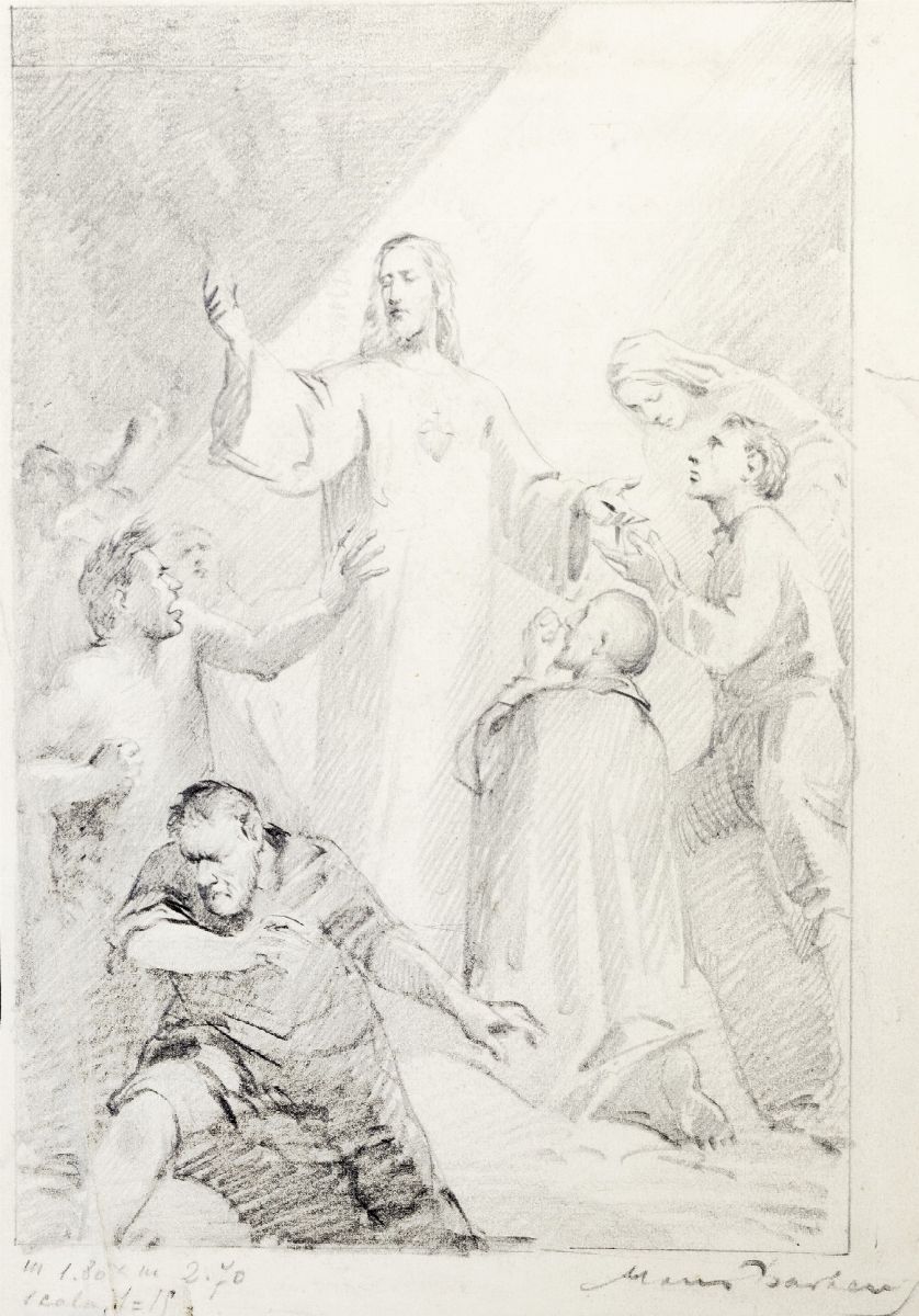 Collaboratore dei maggiori ordini religiosi e dagli anni Trenta decoratore pittorico e mosaicista in chiese, cappelle e oratori in Italia e all’estero, nonché fecondissimo illustratore e autore di popolarissimi santini, Mario Barberis è particolarmente caro a Bruno Mantura, autore di un saggio sui suoi rapporti con l’architetto Antonio Barluzzi nel volume Artisti italiani in Terrasanta [1]. Nella collezione Mantura compare, infatti, un nucleo di opere, che copre le diverse fasi della produzione dell’artista, allievo dell’Accademia Albertina di Torino. Datato 1911 è un primo disegno raffigurante un giardino (lotto 85, b), che colpisce per il talento del giovane disegnatore, appena diciottenne, con il quale aveva strappato a Ugo Fleres l’esclamazione “questi non è un giovanotto: è la personificazione di un lapis!” [2]. Dopo aver partecipato alla Prima Guerra mondiale come soldato semplice con compiti di disegnatore nel reparto Genio Aerostieri, Barberis si era stabilito a Roma e aveva ripreso la sua attività artistica. Risale a questo periodo (lotto 85, a) il disegno intitolato Tra le siepi fioriscono sempre fiori per gl’italiani datato 1918 e chiaramente riferito alle celebrazioni per la fine della guerra. Al tema della guerra potrebbe forse riferirsi anche l’enigmatica composizione La bella follia (lotto 88, a), come intuito da Mantura: “è possibile che il foglio –studio di una copertina di rivista o per una pala, considerando la sagomatura dell’immagine – abbia un significato patriottico” [3]. Importanti sono gli stimoli ricevuti a ridosso degli anni Venti, oltre che dalla grafica simbolista, da Giacomo Balla, dal divisionismo romano e dal cenacolo modernista di padre Genocchi, a cui si era accostato attraverso il letterato Giulio Salvadori. Testimonianza della ricerca sulla luce portata avanti in questo periodo sono i pastelli Luci nel vicolo (lotto 86, a) e Preghiere (lotto 110) e l’olio Le donne al Calvario. Attraverso la mediazione di Salvadori, Barberis venne in contatto con i francescani di Terrasanta, che stavano costruendo il santuario del Getsemani e nel gennaio 1920 gli commissionano un modello preparatorio per la decorazione dell’edificio sacro, che non incontrerà, tuttavia, il favore dell’architetto Giulio Barluzzi [4]. Il disegno In Emmaus (lotto 84, a) conferma la sua presenza a Gerusalemme nell’estate dello stesso anno [5].Riferibili all’intensissima attività al servizio degli ordini religiosi, che lo vide, tra l’altro attivo, nella basilica di Santa Maria Ausiliatrice a Torino, nelle chiese Cristo Re e Santa Maria Ausiliatrice a Roma, nel Seminario Romano e nel Collegio Armeno in Vaticano, sono il bozzetto per due pale d’altare, la prima con il Sacro Cuore di Gesù (lotto 87, a), tema a lui particolarmente vicino, e la seconda con l’Assunta e santi francescani. È, inoltre, possibile mettere in relazione il disegno È passato Gesù (lotto 87, b) con una pala per la sede americana dei Padri Passionisti presso il lago Michigan. Può essere, infine, collocato nel secondo dopoguerra Et incarnatus est (lotto 86, c), realizzato a matita su carta nera, che attesta l’evoluzione stilistica dell’artista in direzione di una maggiore geometrizzazione delle forme e dello spazio.