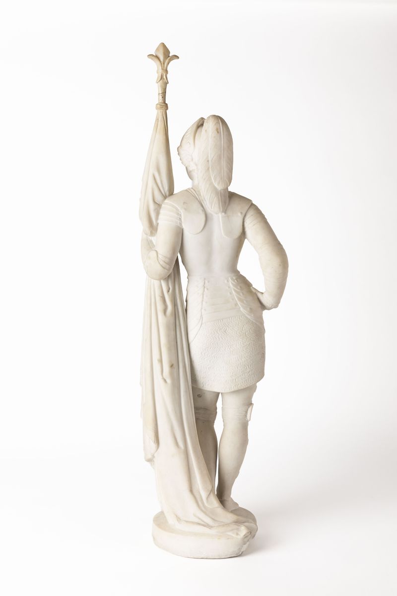 Allievo dell’Accademia di belle arti di Venezia, Rinaldo Rinaldi si perfezionò a Roma all’Accademia di San Luca sotto la protezione di Antonio Canova. Entrato nello studio di Adamo Tadolini si affermò nell’ambiente del neoclassicismo romano, installando nel 1826 il suo studio nei locali di via delle Colonnette dove aveva lavorato il defunto Canova, di cui realizzò, insieme ad altri scultori, il monumento funebre per la chiesa dei Frari a Venezia. Accanto alla produzione monumentale, Rinaldi eseguì anche busti-ritratto e trattò soggetti mitologici e storici. Appartiene a quella fase di transizione in cui lo stile neoclassico accoglie fermenti romantici la statuetta, di cui sono note almeno tre versioni, Giovanna d’Arco. Eroina tra le più significative del Pantheon romantico, la “pulzella d’Orléans” sotto Napoleone era divenuta simbolo del patriottismo e dell’identità nazionale francese per poi assurgere negli anni Trenta dell’Ottocento a simbolo della Francia stessa rivendicato da repubblicani e monarchici, laici ed ecclesiastici. Venerata come santa dalla Chiesa Cattolica, la giovane si era distinta durante la difesa di Orléans, assediata dagli inglesi, che volevano estromettere Carlo, Delfino ed erede legittimo del trono di Francia, e aveva imposto all’esercito francese uno stile di sobrio e monastico. La tragedia pubblicata da Schiller nel 1801 aveva dato impulso a una ricca produzione artistica, che aveva trovato il coronamento nel capitolo della monumentale Storia di Francia dedicatogli nel 1841 dallo storico Jules Michelet. Oreste Raggi illustra l’opera in esame un articolo, corredato da una tavola incisa di Francesco Garzoli su disegno di Paolo Guglielmi, comparso nel 1837 sul periodico “L’Ape Italiana delle Belle Arti”. Secondo la guida degli studi di scultura di Roma del 1841 del conte Hawsk Le Grice una Giovanna d’Arco è realizzata su commissione della duchessa di Sutherland, mentre un’altra versione è ricordata nel 1858 da Napoleone Pietrucci come proprietà del cavalier Nicolò Vigodarzere. Sottolinea da Raggi che Rinaldi trasfigura l’eroina romantica attraverso il suo bagaglio culturale neoclassico, facendole assumere la posa dell’Apollo sauroctono “sotto la sembianza di una bellissima giovane, vestita di un’armatura di acciajo, portante sul petto la croce, con elmo in capo, e la visiera alzata, che stesse come in atto di riposare in piè ritta. Sostenendosi colla manca al suo stendardo piega alcun poco da questo lato e poggia la destra sopra l’altro fianco”[1]. Più problematica appariva agli occhi del critico, tuttavia, la questione dell’abbigliamento di foggia medievale, che colloca l’opera nella sfera della produzione troubadour: “È questione fra gli artefici se possa ciò convenientemente usarsi avvisandosi alcuni che mal si addicano le attillate vesti alla statuaria, cui meglio conviensi la nudità ovvero il grandioso panneggiare; ed altri opponendo, non senza qualche ragione, che i moderni uomini con moderni abiti debbansi vestire; chè se poco si mostrano appariscenti sia colpa dei nostri meschini costumi, non tanto dello scultore” [2]. Era questo, infatti, un dibatto molto acceso negli anni Trenta dell’Ottocento, che affondava le sue radici nel dialogo tra Canova e Napoleone, in cui l’artista aveva citato come strumenti del linguaggio della scultura il nudo e il panneggio all’antico.