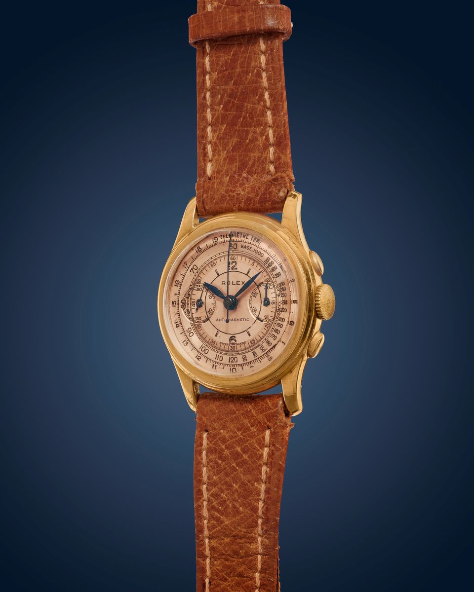 Note: La referenza 3055 fu introdotta originariamente negli anni '30, e proclamata come il cronografo da polso più piccolo al mondo. Gli esemplari della prima serie si distinguono per i pulsanti ovali, come il presente orologio, mentre i modelli della seconda serie, reintrodotta negli anni '50, hanno i tasti del cronografo di forma rettangolare.