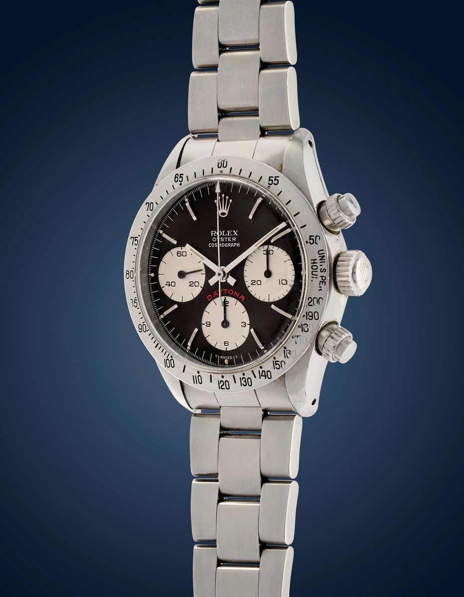 Note: Il Daytona 6265 venne presentato al mercato nel 1969, insieme alla referenza gemella 6263; rimasero in produzione sino alla fine degli anni ’80, quando Rolex introdusse il suo primo cronografo con movimento automatico, la referenza 16520. Visto il lungo periodo in cui rimasero in commercio, il 6263 e il 6265 sono forse i due modelli Daytona per eccellenza: l’orologio in catalogo rappresenta la versione più iconica e desiderata dai collezionisti, con la scritta Daytona stampata in grandi caratteri rossi e denominata appunto “Big Red”.