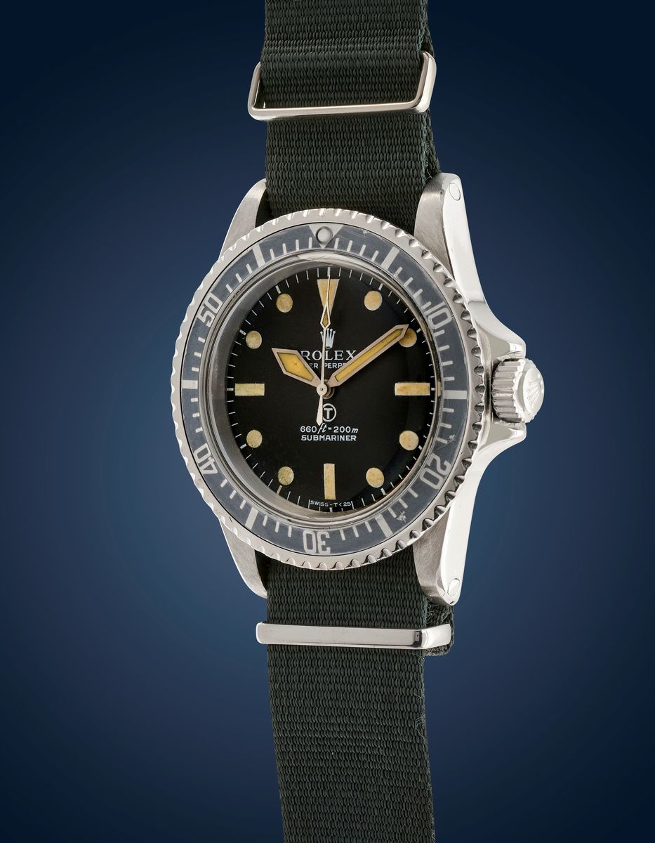 Note: Ad inizio anni 70 il Ministero della Difesa Britannico commissionó a Rolex un orologio con rigidi requisiti militari: barrette fisse saldate alle anse della cassa per maggiore robustezza, un inserto calibrato sui 60 minuti, ampie sfere a spada per maggiore leggibilità, e un quadrante luminescente marchiato con una "T" in un cerchio per specificare l'utilizzo di trizio.