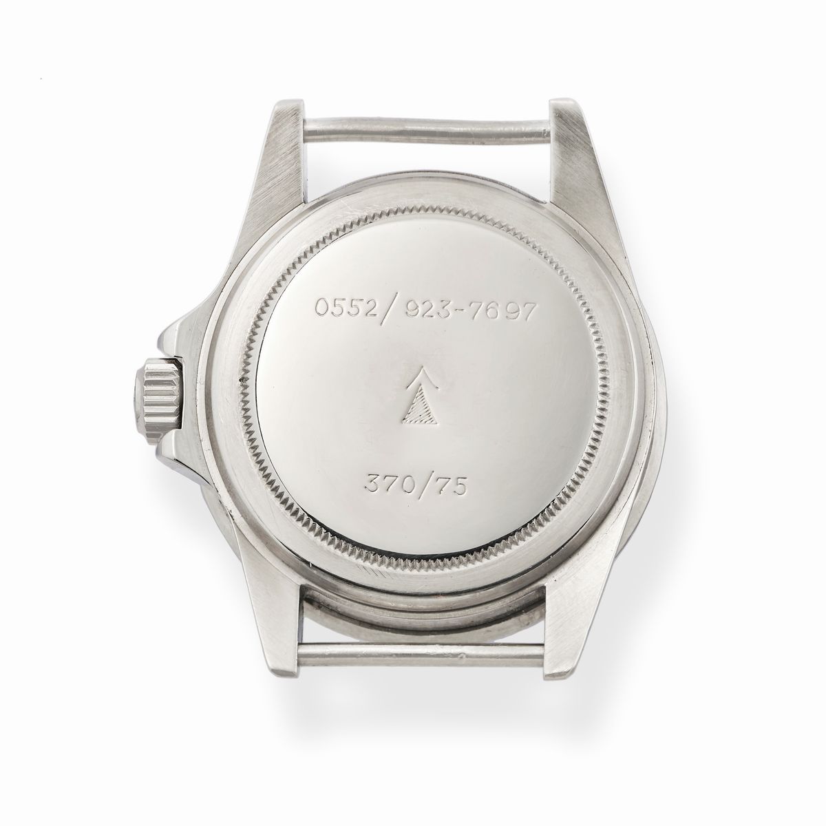 Cassa rotonda in acciaio, n.3927201, barrette fisse, lunetta nera virata al blu in alluminio, fondello inciso con Broad Arrow e assegnazione "0552/923-7697, 370/75", seriale riportato all'interno.