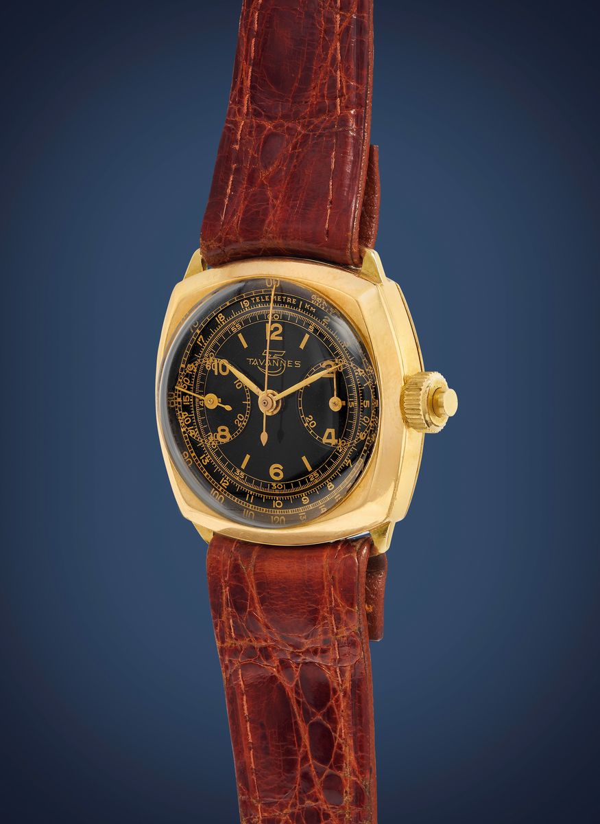 Cassa a cuscino in oro 18k, monopulsante integrato nella corona.